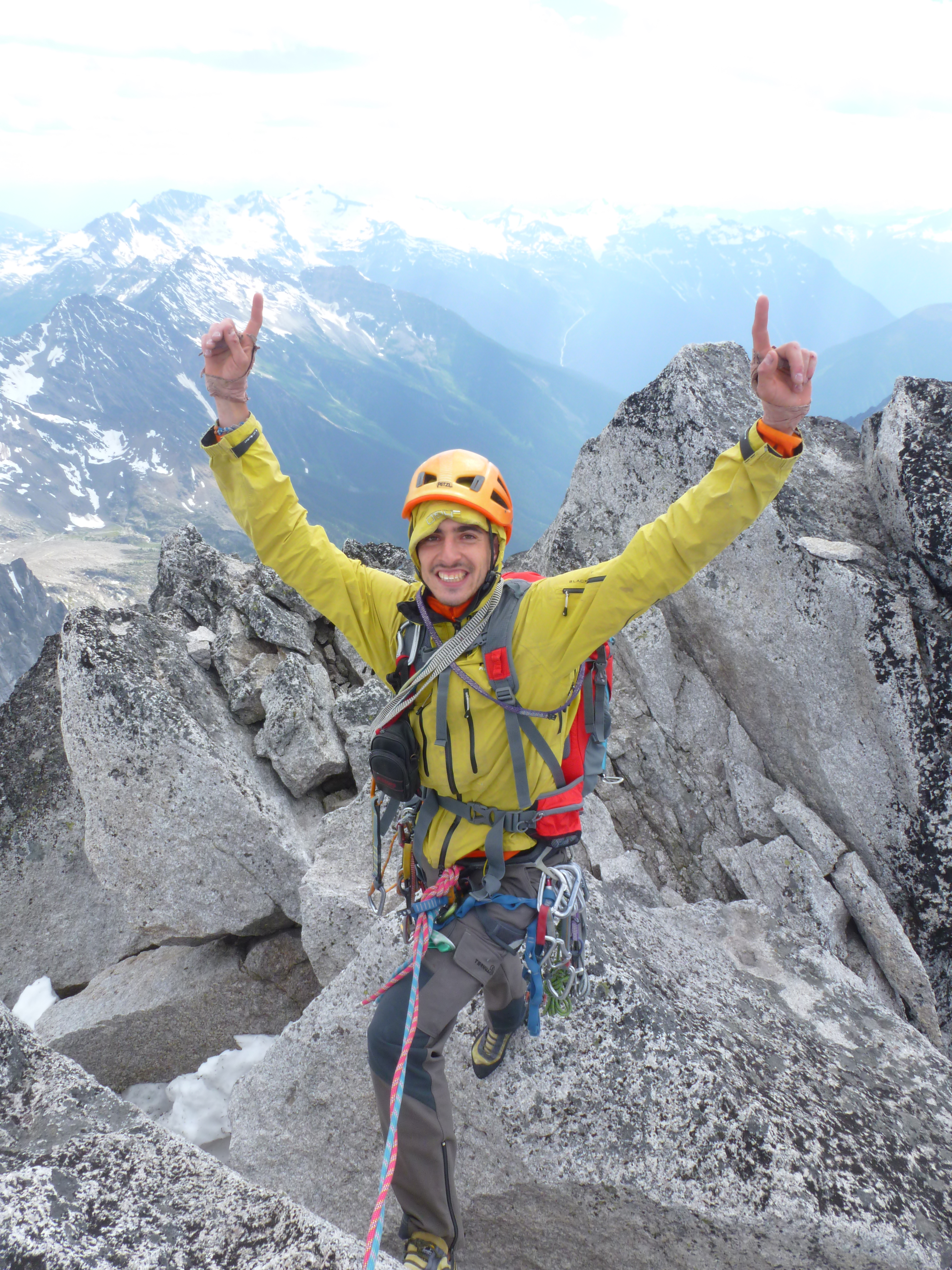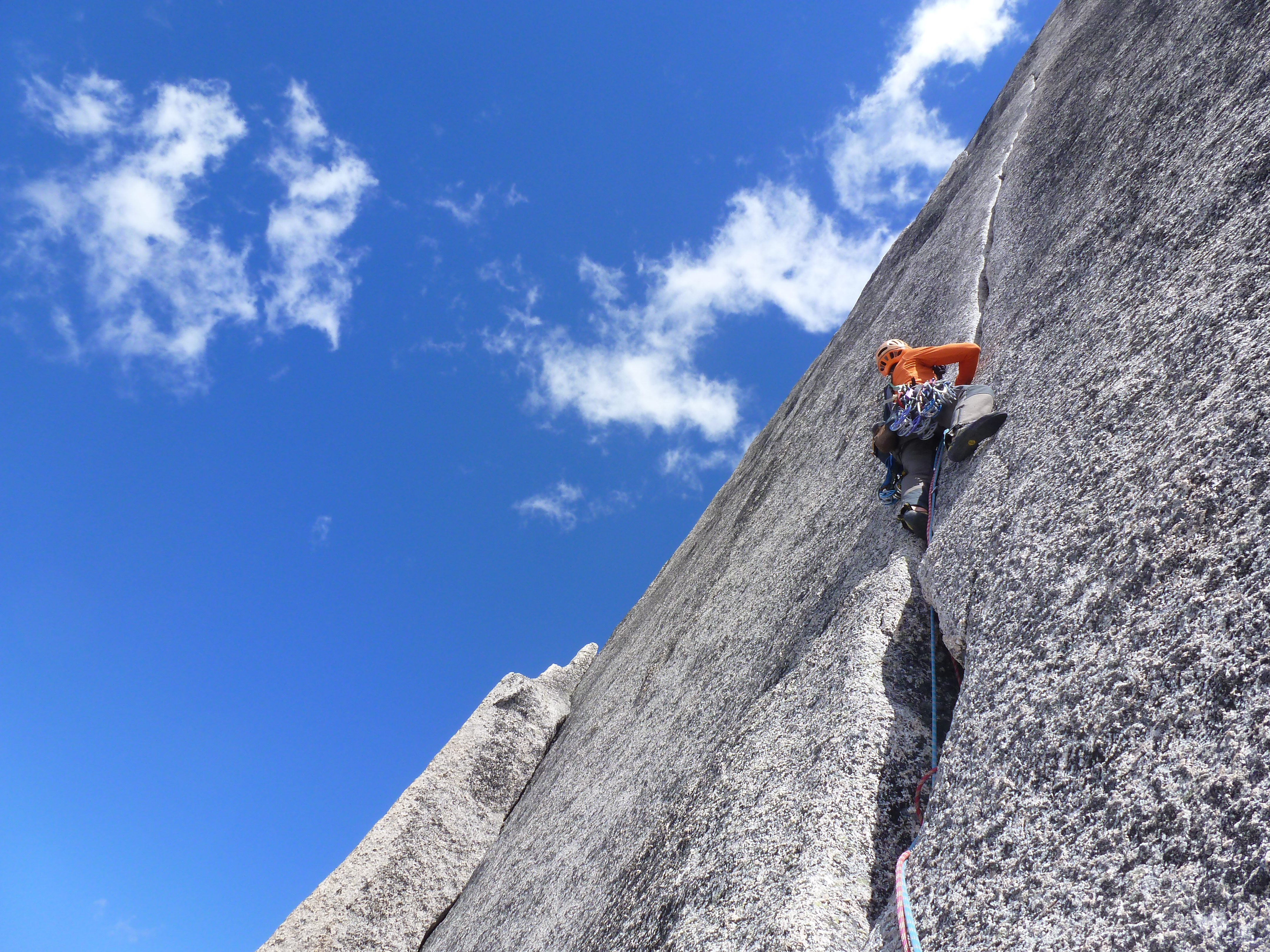 Una tímida luz ilumina el cielo y es 3 de julio, mi cumpleaños. El año pasado escalamos la «Out of Africa» en Madagascar y esta año nos toca otra gran clásica a modo de regalo, la «Beckey-Chouinard» al South Howser, casi un kilómetro vertical de aventura. Una gran línea para subir una gran pared. La nieve de la aproximación hoy está algo más dura que el día anterior, aunque subimos sin crampones hasta el comienzo de la vía donde una cordada de tres canadienses se prepara para empezar. Tras hablar un rato con ellos acceden a dejarnos pasar, adelantándoles al ensamble mientras una intensa luz anaranjada marca el amanecer. Nos toca el primer resalte de 5.10 (un 6b en escala francesa). Tiro de primero con la mochila cargada y tras un pasito tonto sobre un microfriend estoy debajo de un techo donde puedo protegerme mejor. Empotro la mano derecha y ¡zas!, mi pie izquierdo se resbala y vuelo sin motor. Sigo hasta la reunión para asegurar a Javier y soy testigo de que también se le escurre el pie en el mismo sitio y se cuelga. En la reunión comentamos lo sucedido mientras nos comemos unas barritas. Los largos se van sucediendo entre diedros, chimeneas y fisuras hasta llegar al bastión final de la torre. Las vistas son espectaculares y a partir de entonces nos tocará escalar a la sombra por encima de 3000m. Javier se embarca en un largo y abre una variante más sencilla al paso más duro de la vía. De este modo, solo seis largos de trepada nos separan de la cumbre, a la cual llego reventado! Sin duda, una vía magnífica abierta en un estilo muy puro.