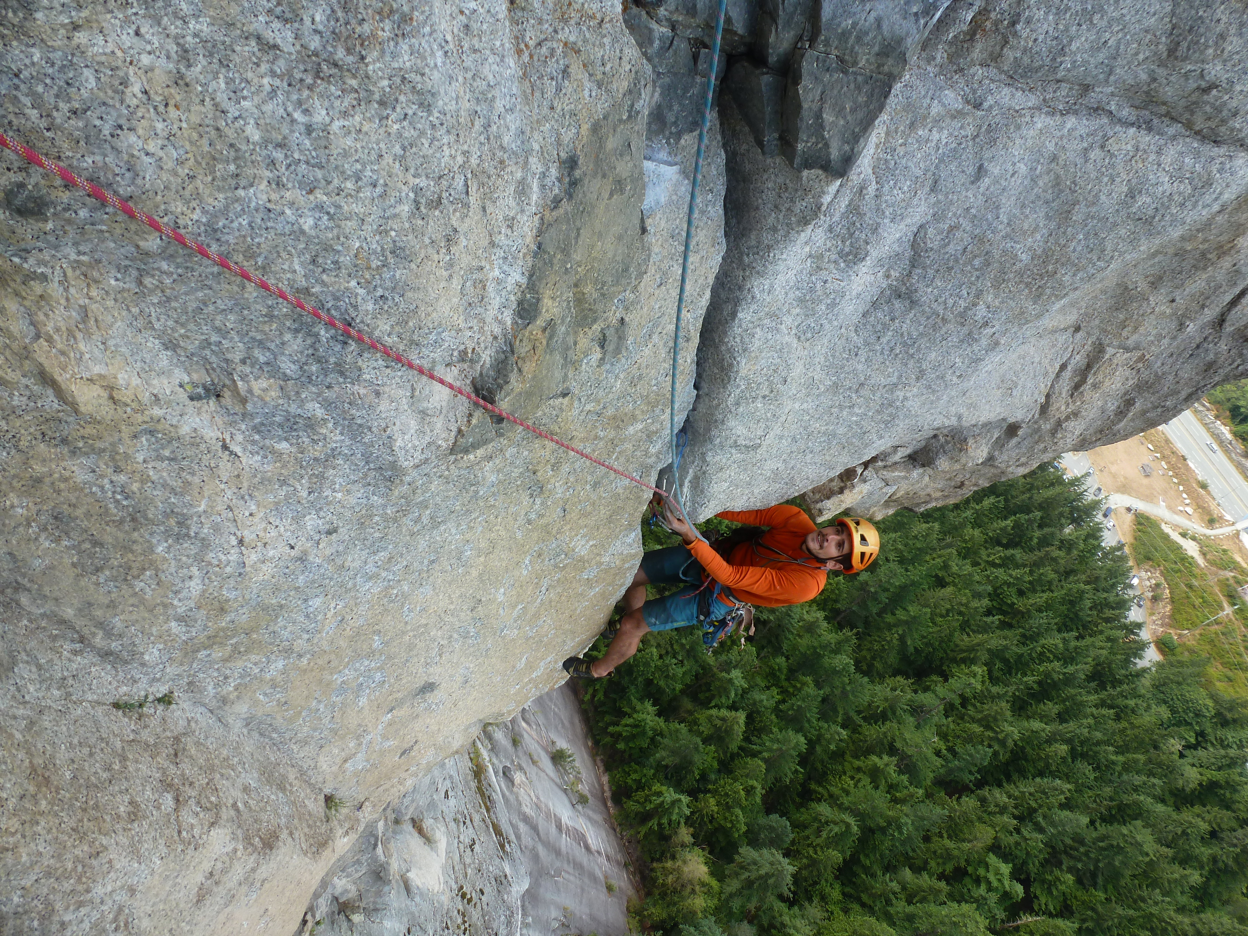 La nieve que cubre el glaciar se encuentra en muy malas condiciones, ya que ha sido un invierno extremadamente seco y un verano anómalamente caluroso, y decidimos no asumir más riesgos y cambiar de aires. Atravesamos las Rocosas hasta Vancouver, 700km de conducción que no se hacen largos debido a la belleza del paisaje. Bosques infinitos, lagos turquesas, glaciares abiertos y paredes oscuras son la tónica del viaje en el que hacemos una parada para bañarnos en el lago Columbia. Pasamos debajo del Mount McDonald, un paredón impresionante que recuerda a la norte del Eiger. Vancouver es una ciudad interesante sobre la bahía del mismo nombre, en la que no es difícil ver orcas y ballenas jorobadas. Al igual que otras ciudades de la costa Oeste, como Portland (Oregon) o San Francisco, presenta un aroma alternativo entre alguna de sus calles. No así, en las calles Hastings con Cordoba, en pleno centro financiero de rascacielos, donde las autoridades han decidido hacer la vista gorda y decenas de yonquis se pinchan en la acera mientras encorbatados caminan con normalidad. Comemos en el barrio chino en un restaurante más chino que un juguete de plástico y hacemos algo de compra para nuestro siguiente destino, Squamish. Allí pasaremos los próximos diez días disfrutando de su excelente granito y de la comodidad de las aproximaciones cortas. Squamish probablemente sea el destino de escalada más internacional de Canadá. En su camping de escaladores coincidiremos con Eduardo (madrileño) y Jessica (catalana), con los que rápidamente haremos buenas migas. Él ya ha dado dos vueltas al mundo, mientras que ella va por la primera, y aunque han empezado a escalar hace poco, enseguida estarán apretando. Nos explican muchas cosas de Canadá, donde están viviendo los últimos años y también de sus viajes alrededor del mundo.