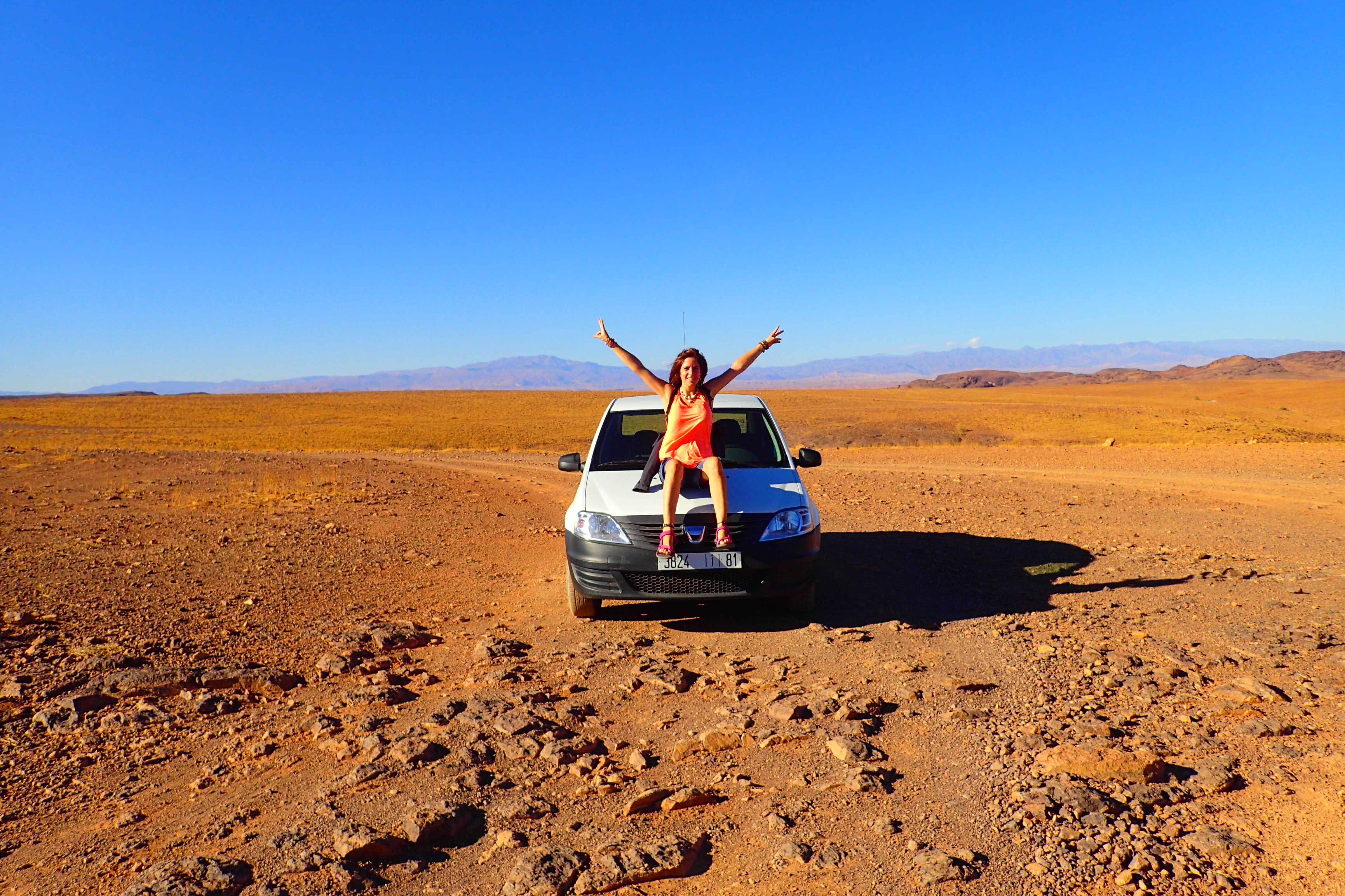 Al día siguiente alquilamos un coche, que será nuestro compañero de aventuras incondicional el resto de jornadas y digo incondicional porque no nos abandona ni al coronar el tremendo puerto de Tizi N’Tichka de 2260m, rumbo a la ciudad de Ouarzazate. En la bajada del puerto paramos a comprar manzanas de productores locales y también a recoger a un hombre, Mohammed, al que se le ha estropeado el coche y está haciendo autostop. Nos hará de guía turístico en la ruinas de Ait Ben Haddou, una de las kasbahs -espacios fortificados de origen bereber-, más espectaculares de Marruecos. No extraña que allí se hayan rodado trozos de películas como Lawrence de Arabia o Gladiator. Mohammed nos invita después a tomar el té del mediodía en su casa y por la tarde nos acerca al poco turístico pero precioso oasis de Fint. Tras recorrer unos cuantos kilómetros por un camino de piedras sin más vegetación que unos pajizos secos, nostálgicos de una primavera inverosímil, llegamos a una surgencia de agua y vida, un oasis en toda regla. El pueblecito de Fint vive de sus palmeras y de otros cultivos como las granadas y los higos. Pasamos un buen rato paseando por sus callejuelas de casas de barro con niños que se esconden a nuestro paso detrás de las esquinas. Al llegar a Ouarzazate, Mohammed nos invita a un segundo té en su casa, una encerrona en toda regla. Nos trata de cobrar sus servicios de guía de algún modo, intentándonos vender una noche en el desierto en la casa de uno de sus muchos primos, o alguna de sus alfombras. Con cortesía y mucha mano izquierda nos escabullimos y nos vamos a buscar un hotel para esa noche. Nos cuesta muy poco encontrar uno limpio y barato (unos 7 euros la noche), y nos damos un paseo por la plaza y el zoco antes de caer rotos de sueño.