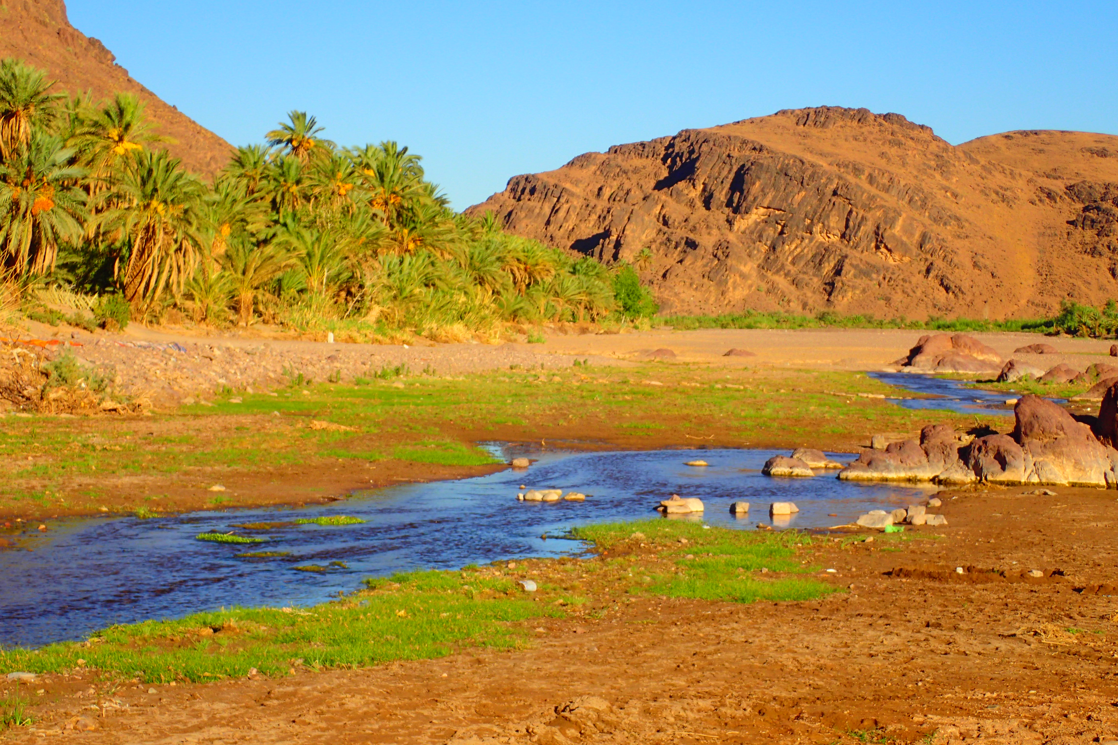 Camino del oasis de Fint, cerca de Ouarzazate. La surgencia de agua contrasta con la aridez del terreno