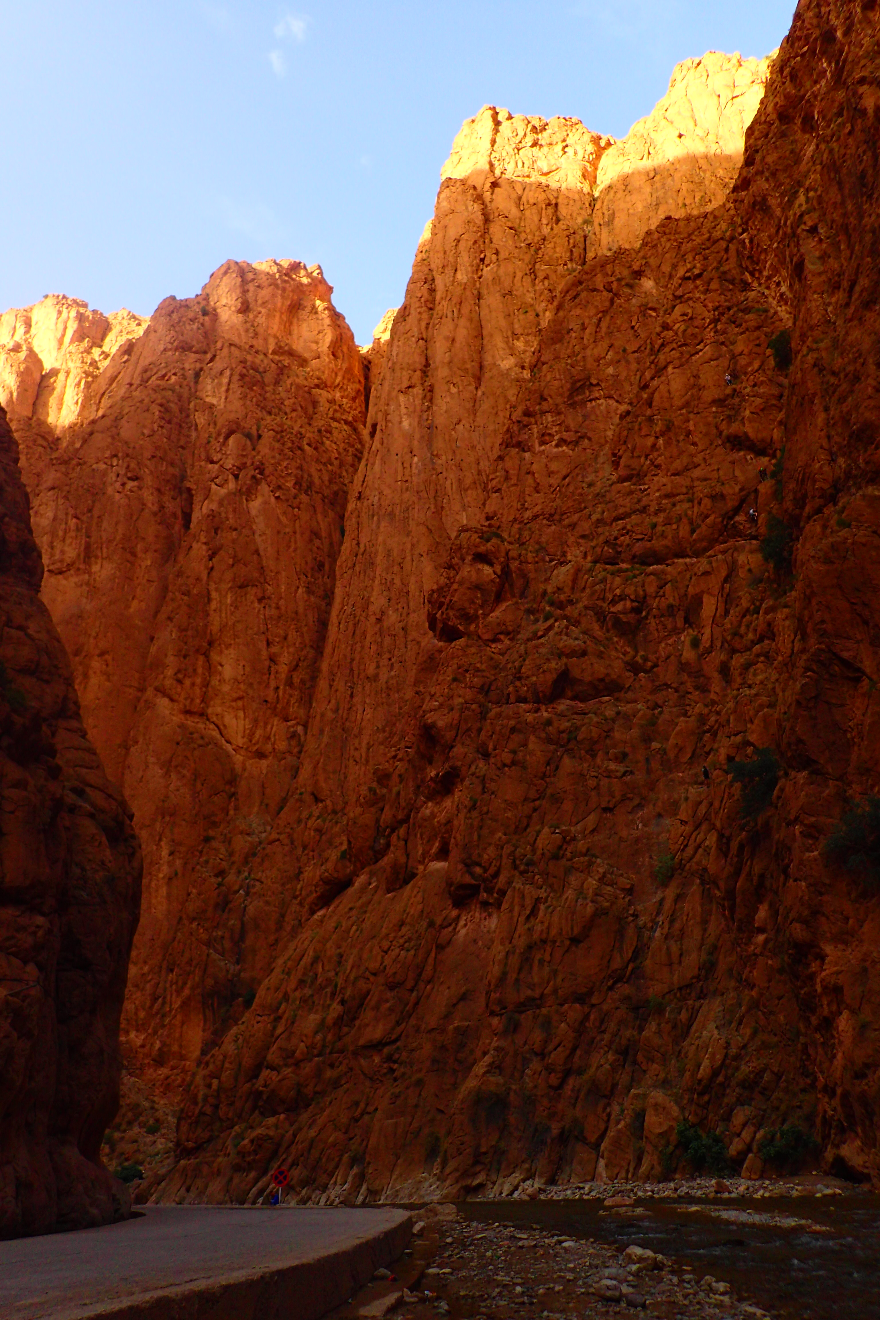La mañana siguiente visitamos la Kasbah de Ouarzazate, un edificio muy singular de tres plantas. En la primera planta vivían los esclavos, en la segunda las concubinas y en la tercera el dueño y señor de la casa con su preferida. Un ascensor de cuerda comunicaba la cocina con la tercera planta, de tal modo que el señor no se tuviera que mover de sus aposentos para ningún menester. Tras dar un paseo por la medina antigua, continuamos el trayecto pasando por Skoura (otro de los oasis del sur de Marruecos) y recorriendo el valle de las rosas, que en septiembre debería llamarse valle de los rosales verdes sin rosas. Ese día visitamos la garganta de Dades, de una aridez extrema y la de Todra, más verde que la anterior y destino famoso entre los escaladores. Allí en Todra, montaremos nuestro campamento a modo de asientos del coche abatidos y dormimos a la orilla del río.