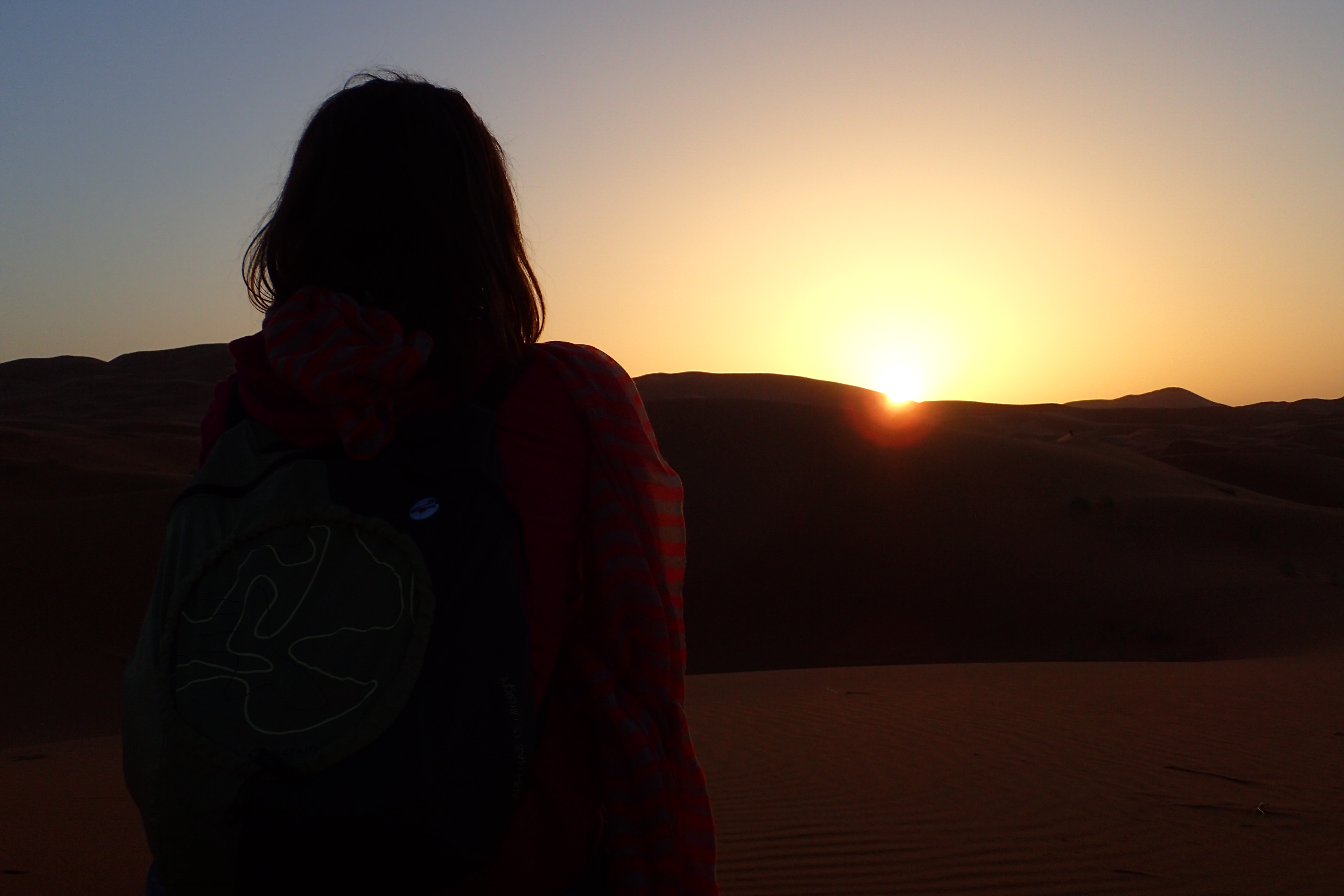 Otra buena sesión de conducción hacia el sur nos hace ir viendo con pequeños detalles la transición del desierto de rocas al desierto de arena. Los pueblos se van distanciando, las cabras dan el paso a los dromedarios y los pozos rompen un horizonte de llanuras estériles. Llegamos a Rissani, ciudad que gozó de un gran esplendor en la época de las caravanas del desierto. Allí visitamos su bonita mezquita. La siguiente parada será Merzouga, la puerta del Sáhara. Allí nos despegamos de nuestro Dacia Logan por otros vehículos de más potencia en la arena y de cuatro patas: los dromedarios. Esa noche dormiremos en una haima en la arena. La belleza de un paisaje de dunas y sus sombras al atardecer y amanecer es indescriptible. Subimos a lo alto de la Duna Alta a través de una fina arista en la que nuestros pies se entierran en la arena suave. En lo alto nos tumbamos y contemplamos el espectáculo del atardecer. La cantidad de polvo atmosférico aumenta los colores y el silencio evoca tranquilidad. Siguiendo la llamada del estómago por el hambre que tenemos, volvemos a la haima a cenar tallín (una especie de estofado de patata, zanahoria, calabaza y carne aderezado con comino y otras especias). Compartimos mesa con otros viajeros de Alemania y Austria, bastante tímidos a la hora de servirse y también a la hora de cantar cuando los cocineros se ponen a tocar música con yembés. Entre esa música noctura y que nos levantamos temprano para ver el amanecer desde la dunas, esa noche no dormiremos demasiado. Al fondo las montañas negras siluetean la frontera entre Argelia y Marruecos.