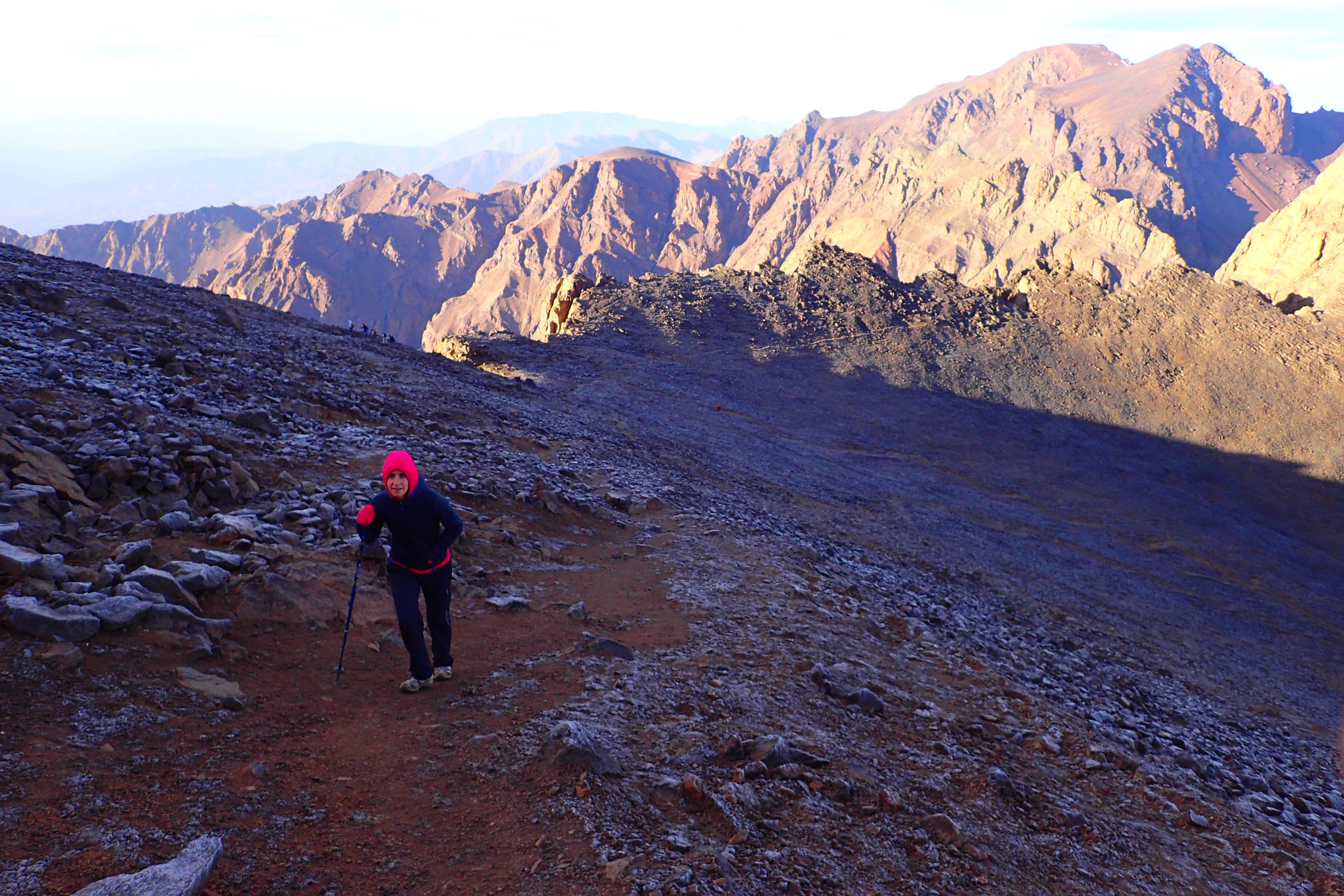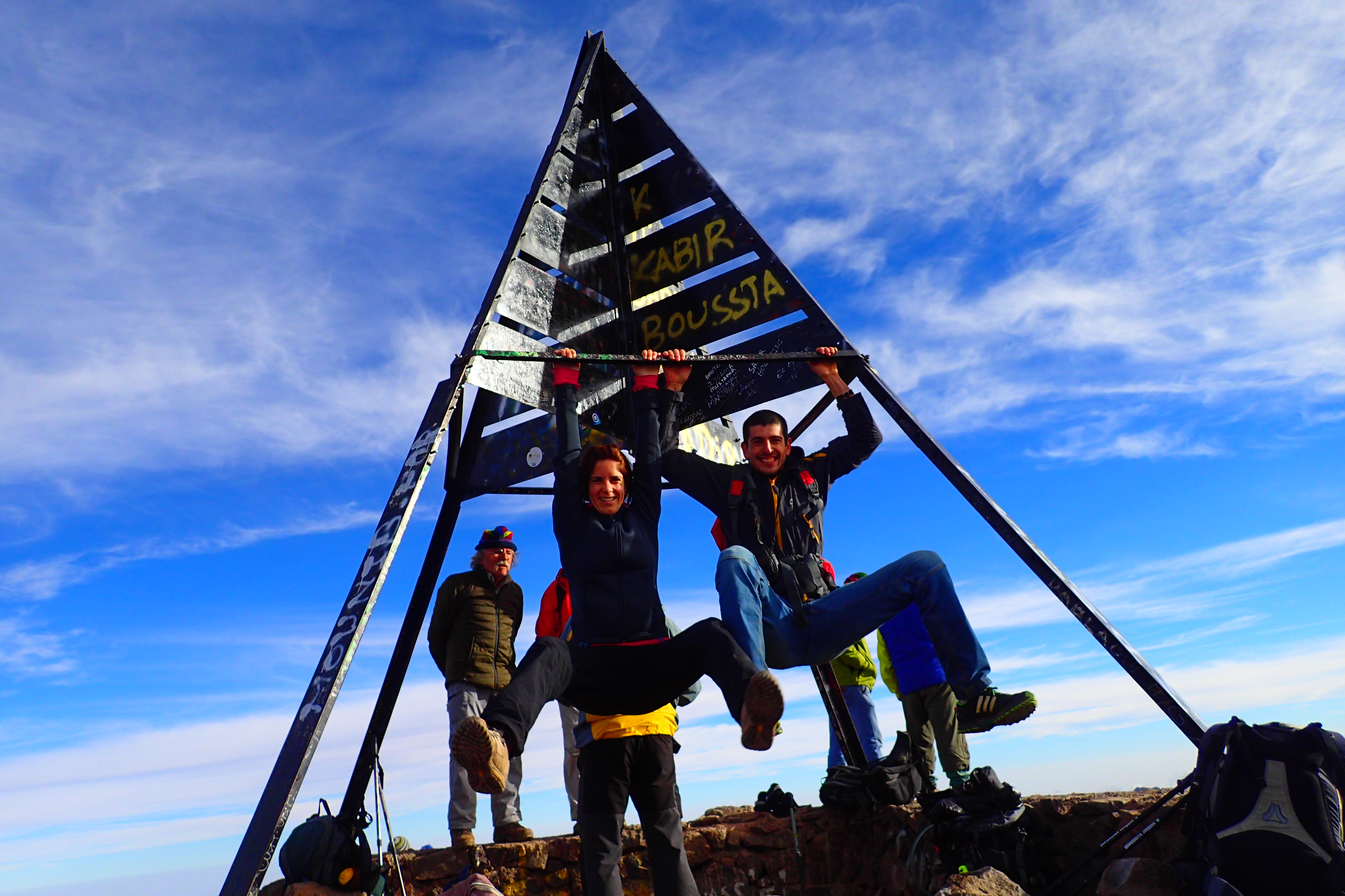 La mañana siguiente conduciremos hasta Imlil, punto de partida del Jbel Toubkal, que con sus 4167m lo convierten en el techo de Marruecos y del norte de África. A pesar de no estar muy bien entrenados y yo de acabar de salir de una lesión grave en mis talones, le damos un tiento sin demasiado compromiso. La idea es dividir la subida de 2500m de desnivel positivo en dos días. El primer día subiremos hasta el Refugio del Toubkal a 3200m, donde cenaremos y dormiremos y el día siguiente intentaremos la cumbre y el palizón de bajada a Imlil. La meteorología nos acompaña y el primer día nos regala nubes que nos evitan sudar de lo lindo en la subida al refugio. Bea se encuentra genial en la subida, y casi sin parar en unas cuatro horas y media estamos tomando el té en el refugio, e incluso ayudando a los cocineros a preparar la cena. Enseguida conocemos a Tony, Fernando y Carlos de Calpe, que como nosotros aspiran a hacer cumbre el día siguiente. Nos echamos unas risas cenando con ellos y hablando de otros viajes. A la mañana siguiente un reguero de frontales iluminan la pedrera de salida del refugio. Vamos adelantando a varios grupos de gente que se pueden permitir un respiro al ir mejor abrigados que nosotros, y es que al no estar entre nuestros planes iniciales subir este pico, lo hacemos con ropa de calle normal. En el último repecho la helada pinta de blanco los guijarros y la luz de butano del amanecer tiñe los otros picos de más de 4000m de ocres. Bea mira con ambición la cumbre de la cual nos separan unos pocos pasos. Es su primer cuatromil y está emocionada. Tras unas fotos de rigor en la cumbre despejada y comer unas barritas iniciamos el tedioso descenso de 2500m de bajada hasta Imlil. Esa noche nos damos un buen homenaje a modo de ducha caliente, hotel bueno y cena aún mejor. Nuestras piernas están resentidas del esfuerzo, pero ha merecido la pena.