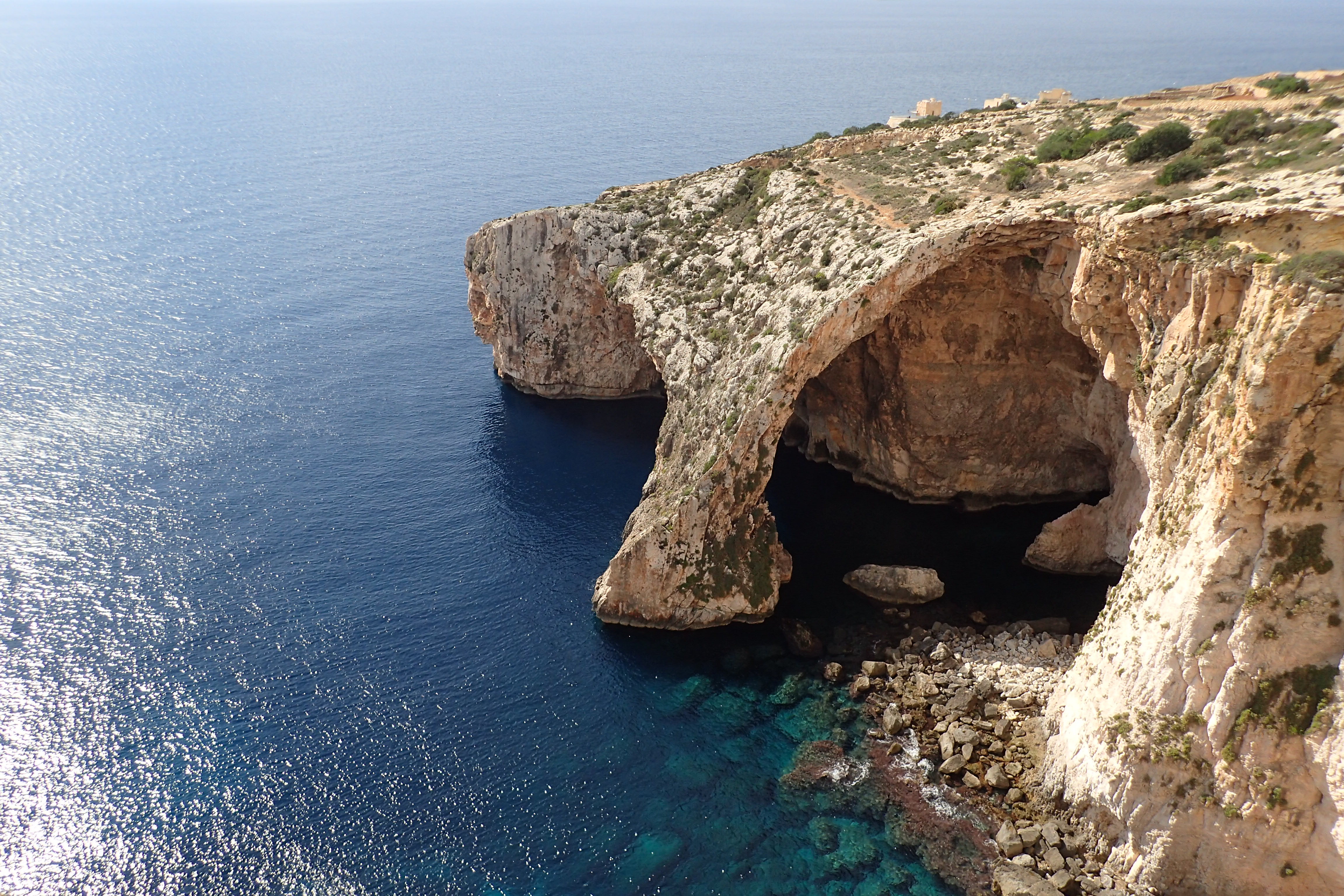 La primera parada la hacemos en la Blue Grotto, una cavidad calcárea de dimensiones gigantescas en un acantilado sobre el mar a pocos kilómetros del aeropuerto. Desde el aparcamiento de esta cavidad también se puede acceder a uno de los sectores de escalada deportiva más conocidos de Malta, el Wied Babu. Este sector está conformado por un barranco con vías a los dos lados que muere en el mar. Predominan las vías de agujeros, y con formaciones de chorreras y estalactitas, que bien merecen una visita.