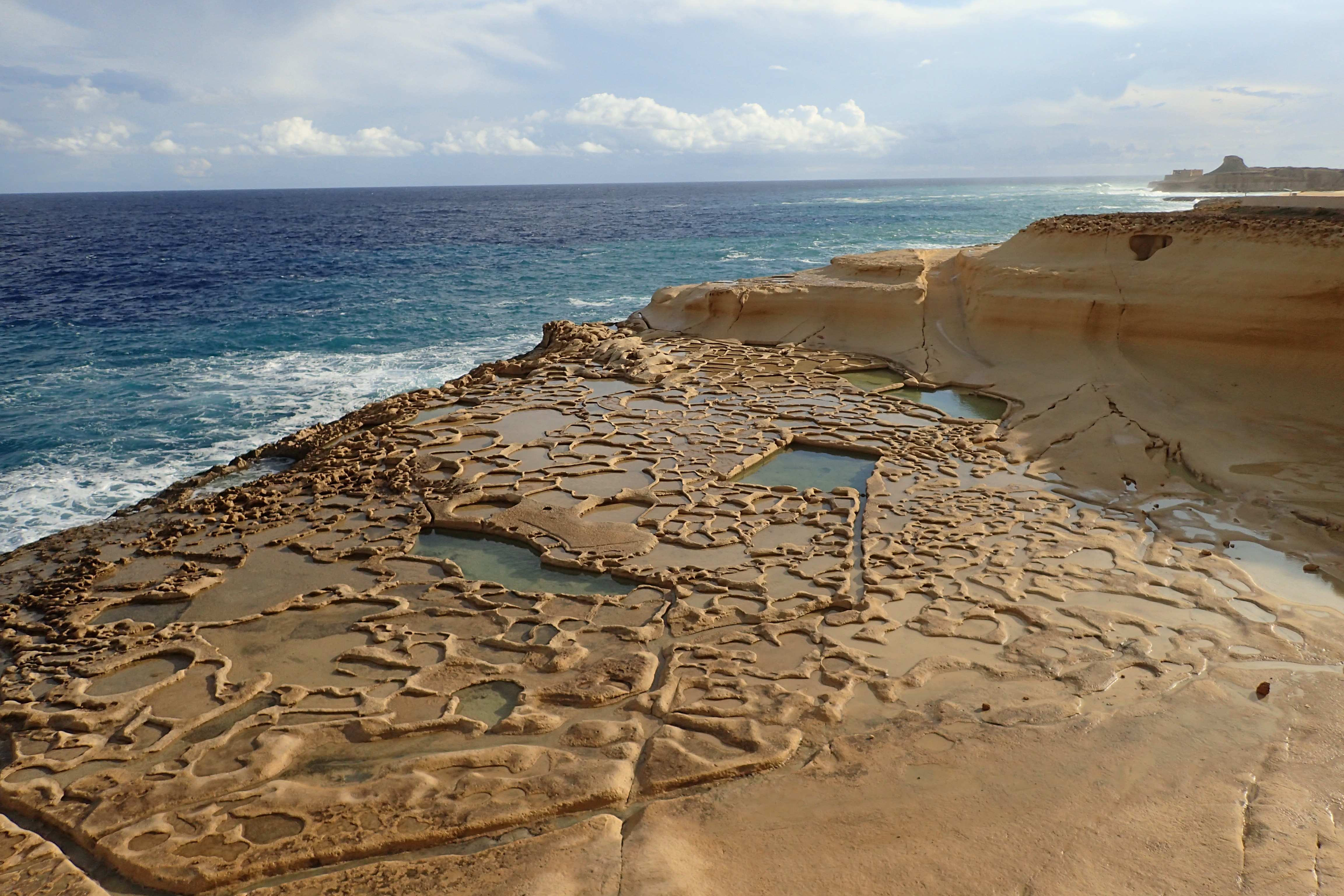 Salinas tradicionales (costa norte de Gozo). El oleaje llena las piscinas talladas en la roca arenisca y con el sol del verano se evapora el agua que libera la sal. Cada localidad dispone de sus salinas y se responsabiliza de su mantenimiento