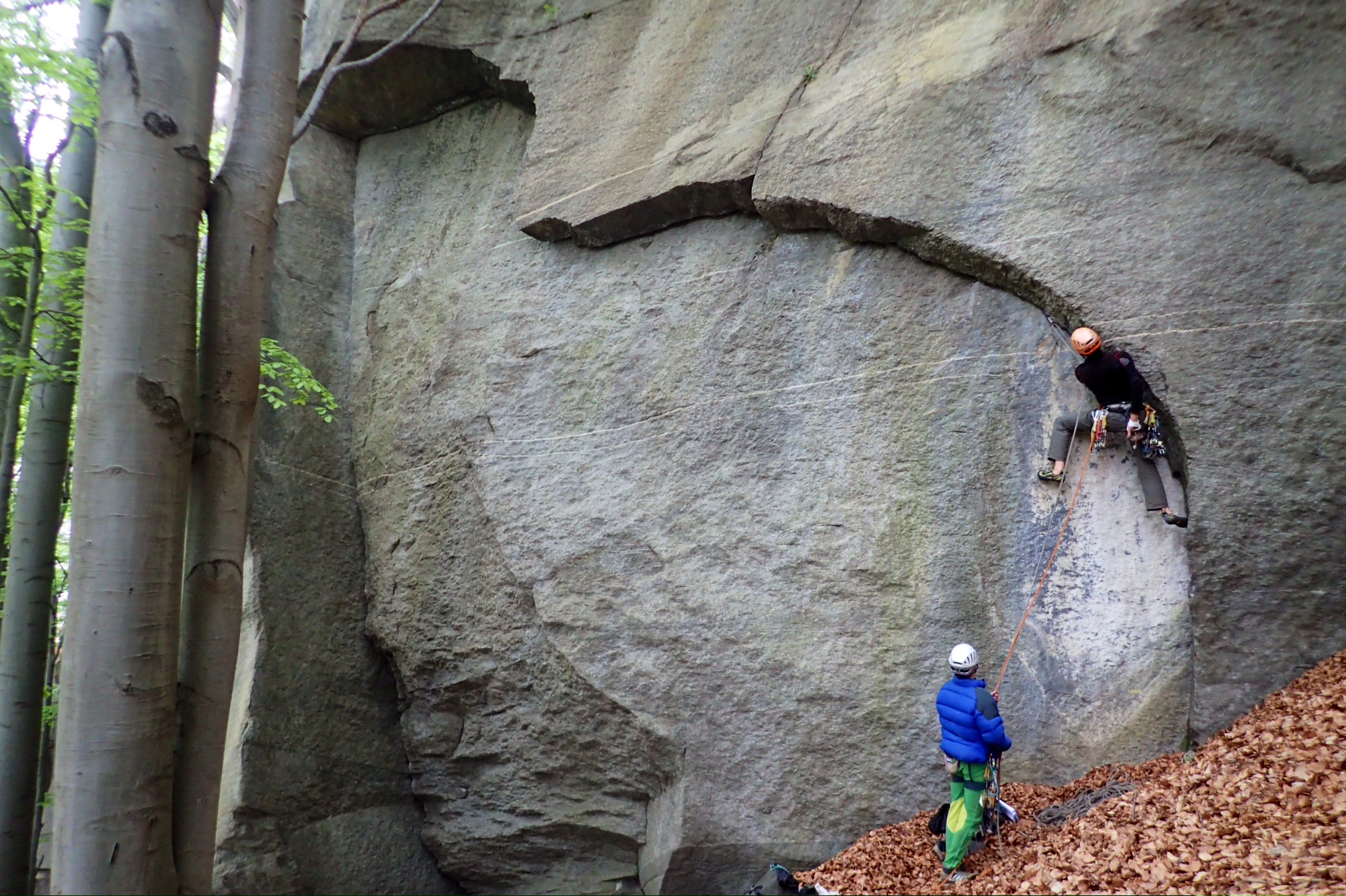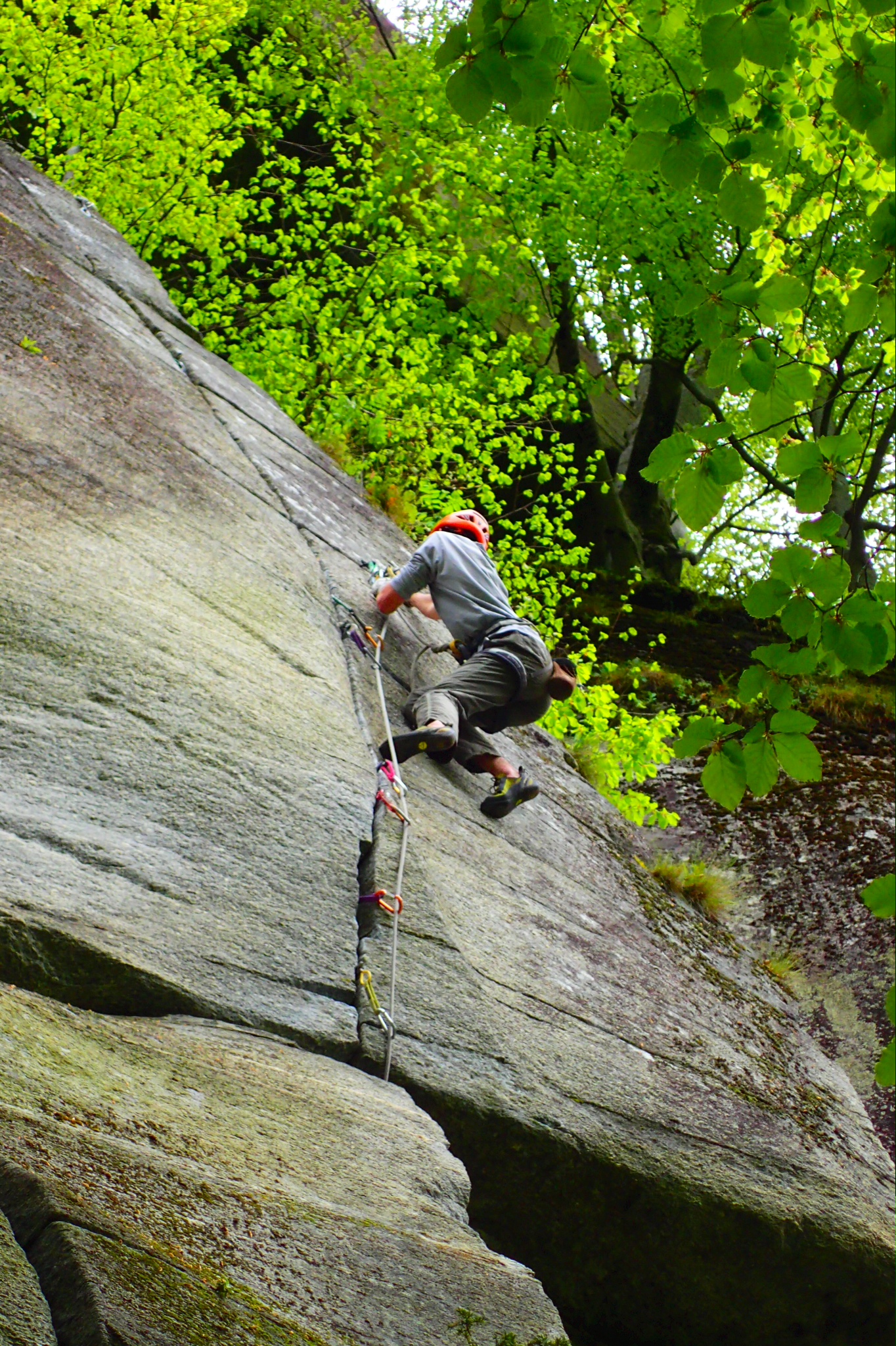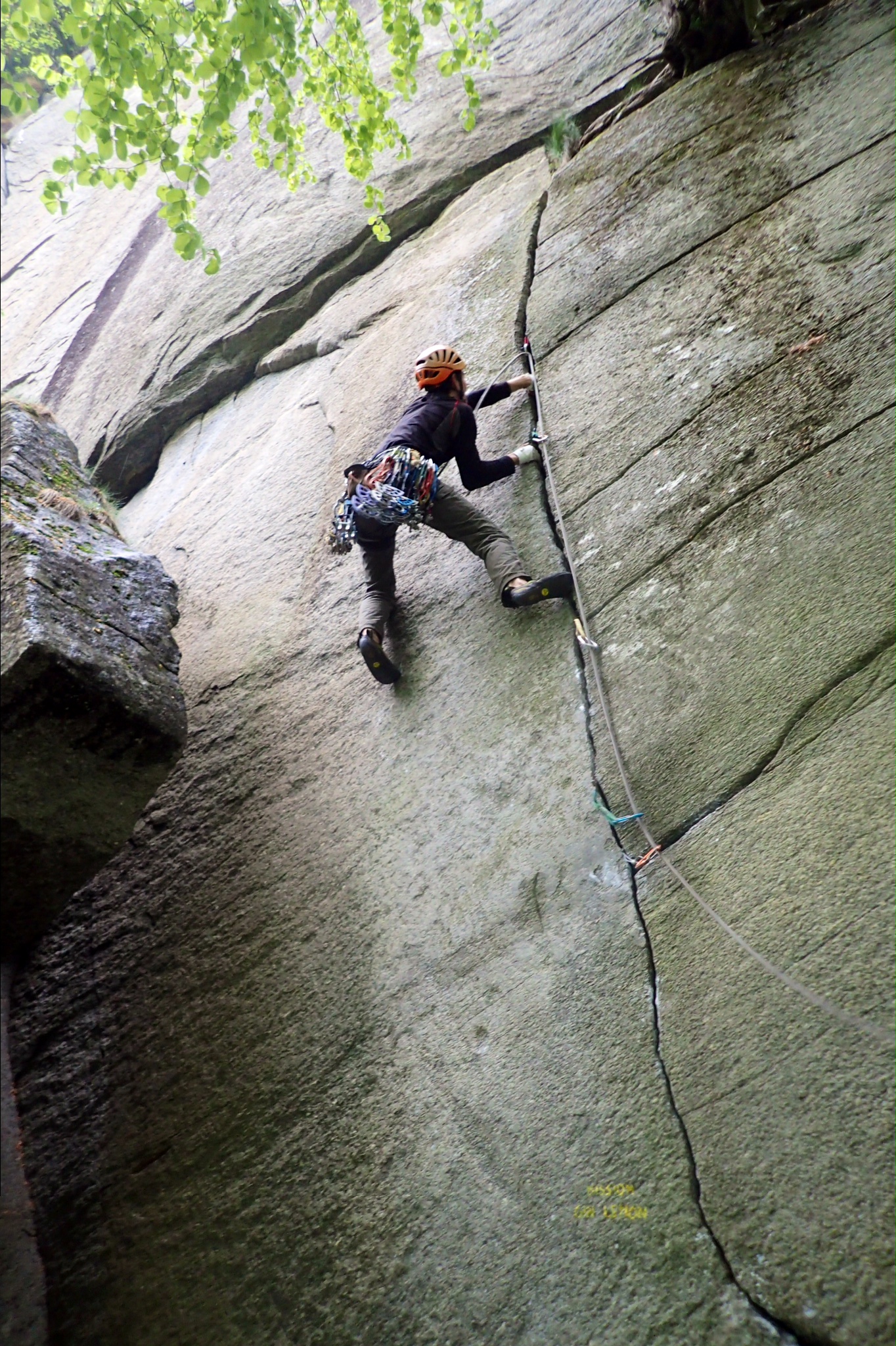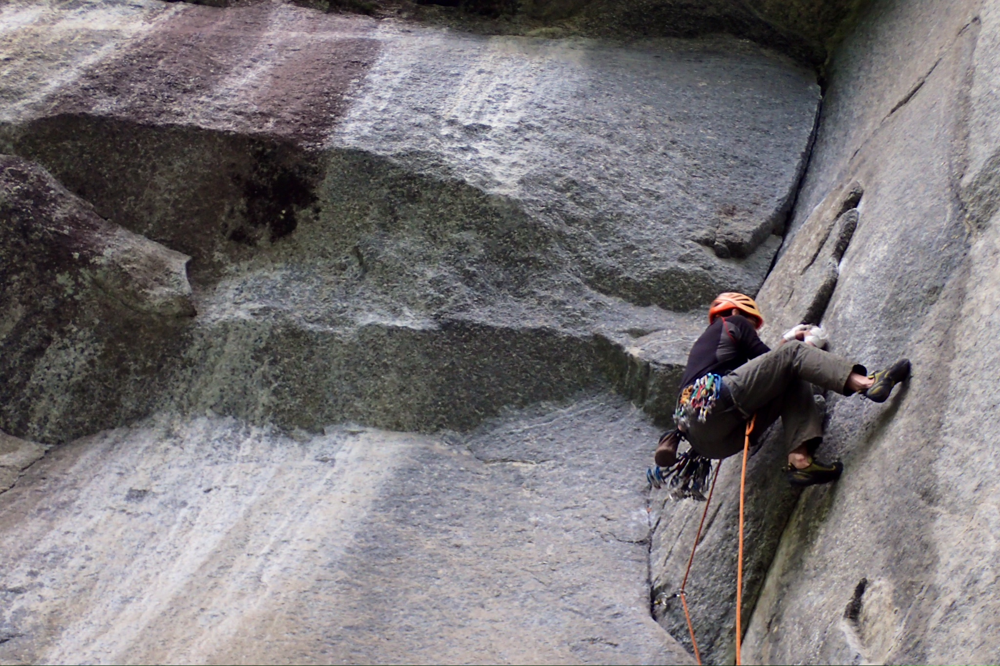 En esta escuela se mezclan increíblemente dos estilos opuestos, el de la escalada de autoprotección y el de las fisuras con parabolts. A mi parecer es una barbaridad chapar estas fisuras perfectas, dada la gran cantidad de espacios que existen en el mundo para la escalada deportiva y los pocos para la escalada tradicional. Aun así, y solo escogiendo las del estilo más limpio, hay muchas vías que nada tienen que envidiar a las de por ejemplo Squamish. Aunque la meteorología es generalmente muy lluviosa en este valle, muchas de sus líneas están protegidas por techos y se pueden escalar secas incluso bajo la lluvia. En este viaje hemos escalado en los sectores Bimbiminkia, Trad Alto, Trad Basso y Secondo Settore porque estaban secas. Con prácticamente dos juegos de friends hasta el 4 de Camalot hemos escalado la mayoría sin demasiados problemas.