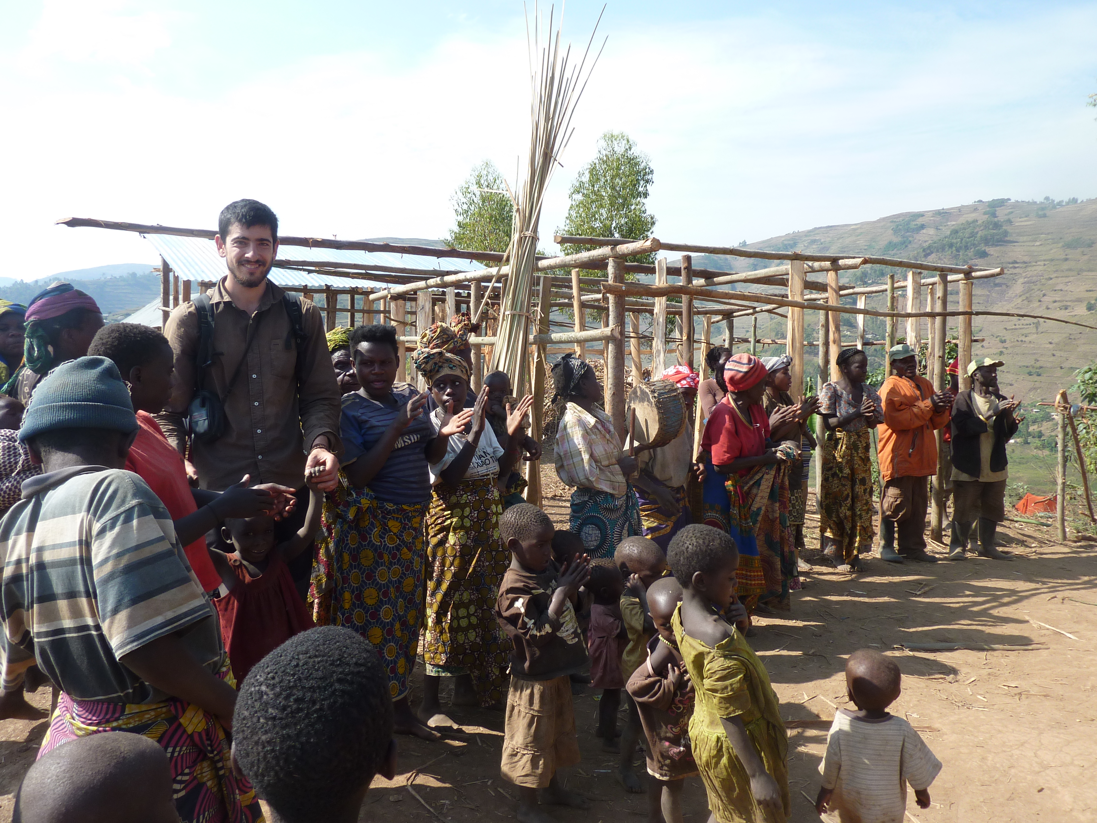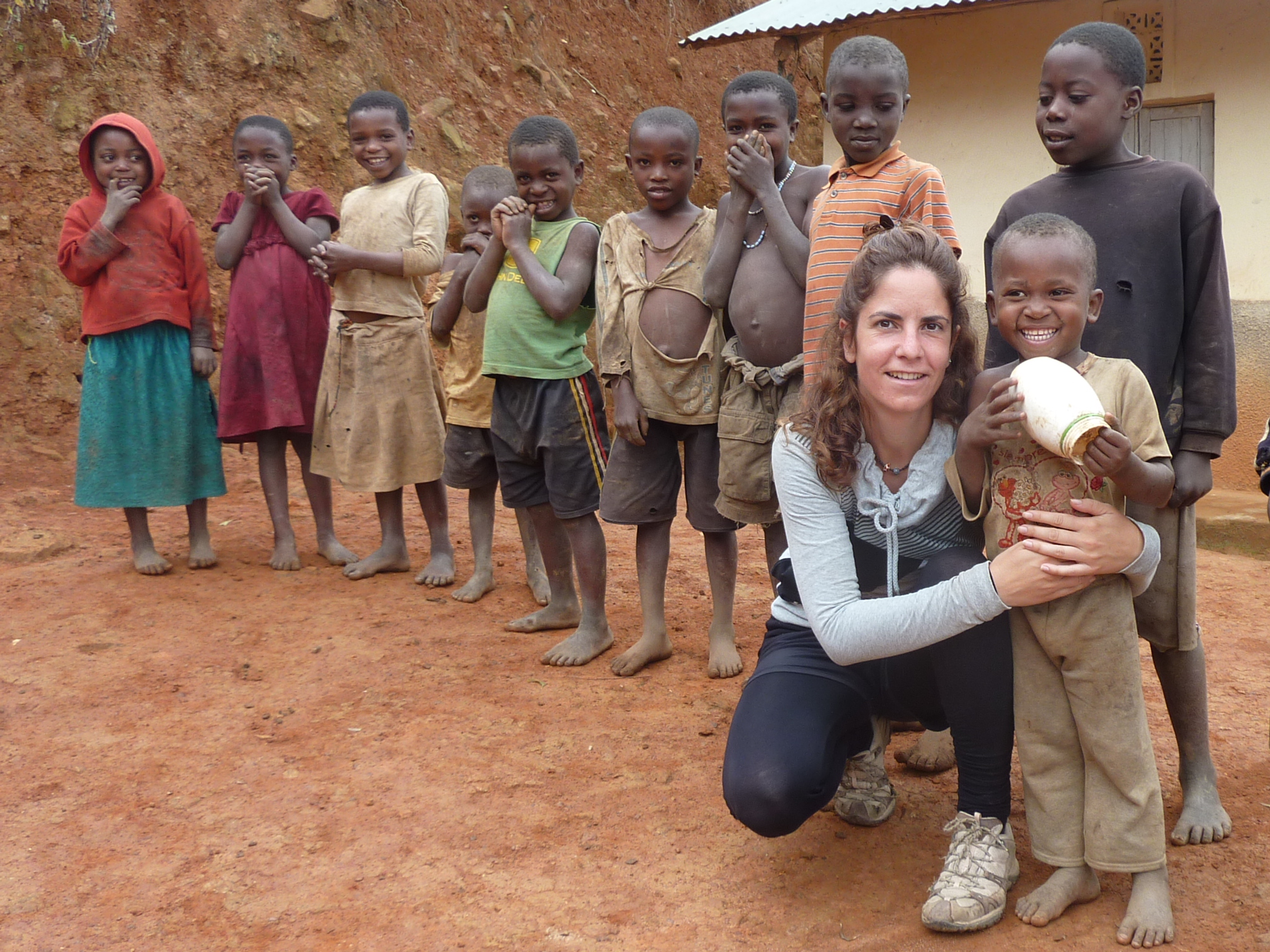 Quizá la jornada que mejor sabor de boca nos dejase sería la del día siguiente entre Musasa y Kinunu. Un sendero precioso, con innumerables paradas para saludar a los niños que desde lo alto de las colinas bajan corriendo a saludarnos bajo los chillos de «muzungu» (blancos). Su voz se propaga como la pólvora por los cafetales y bananeras como el acontecimiento más destacable del día. En Kinunu, agotados por el calor y la humedad previos a la temporada de lluvias, decidimos parar. Esta vez buscaremos la iglesia a lo alto del pueblo como lugar para dormir. Pero tampoco pasamos desapercibidos ya que todos los niños de la escuela salen corriendo a rodearnos. Algunos tocan el pelo rizado de Bea y observan con intriga cómo comemos salchichón.
