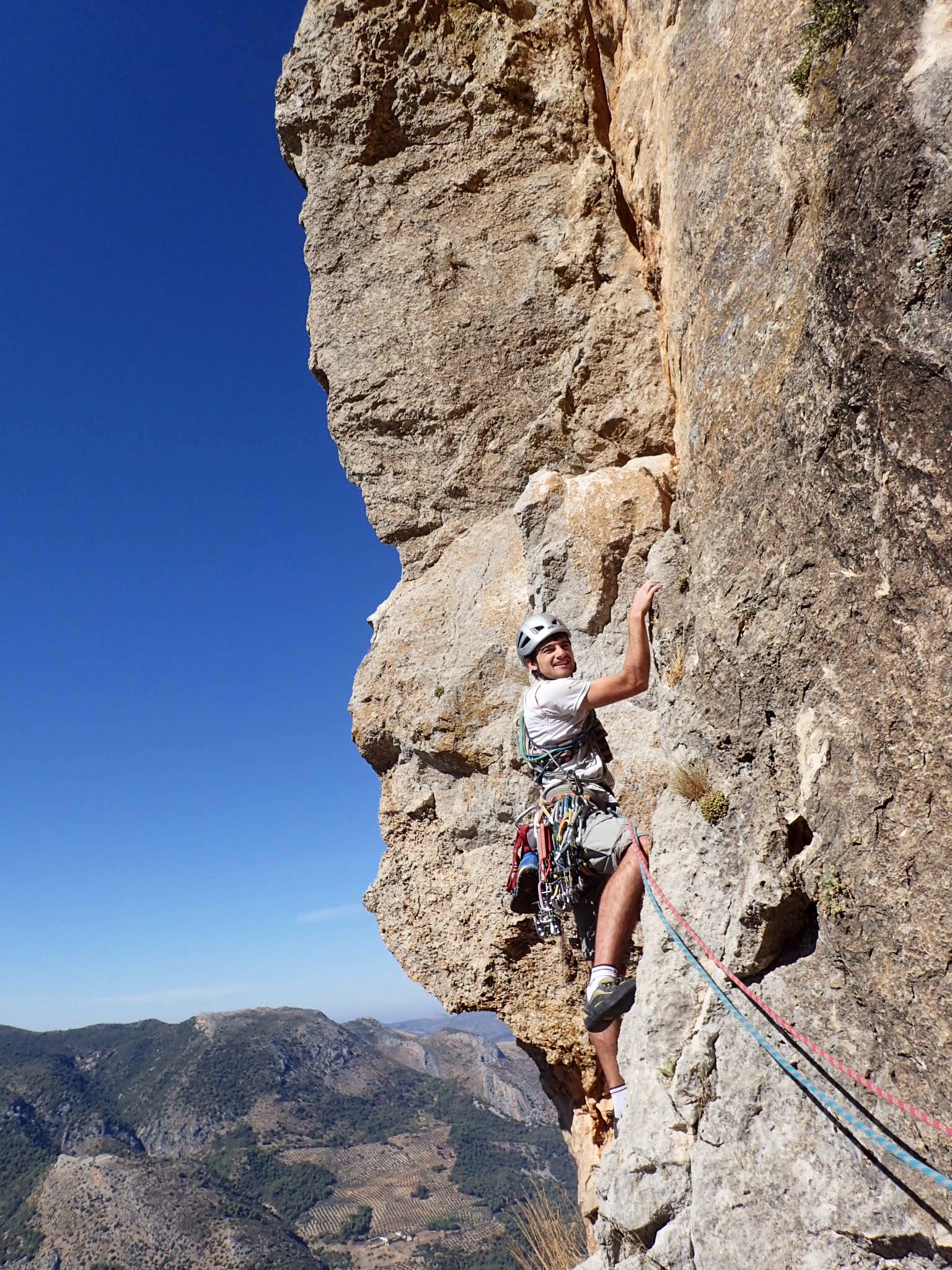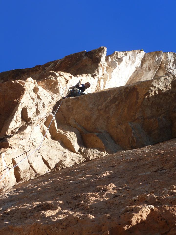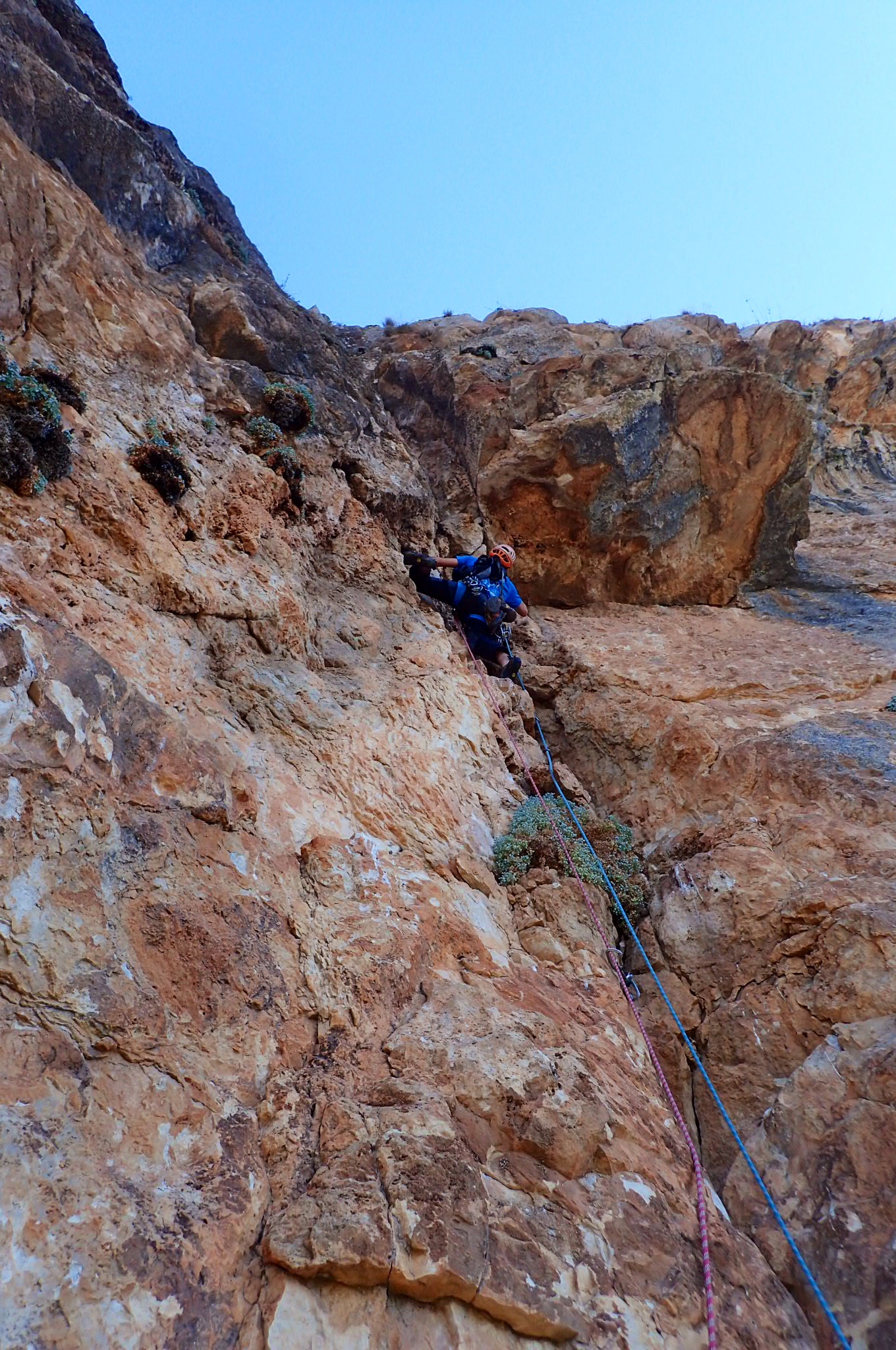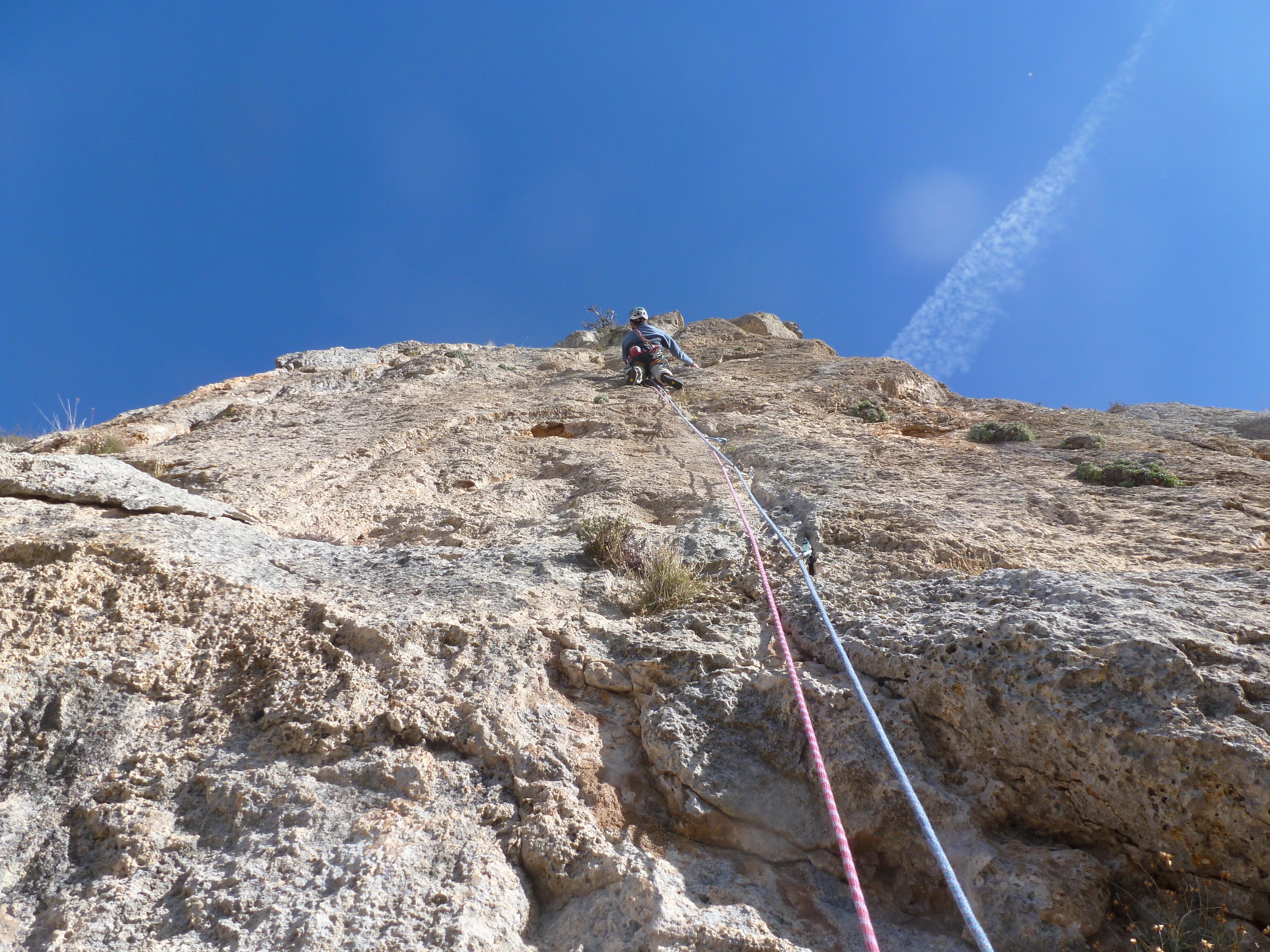 - Kamasutra (200m, 7a+): vía equipada con chapas y multitud de pitones y con un paso bastante borde en el largo clave. La roca más pinchuda que hemos escalado en Alcandoras. El toque expo de la vía lo puso la víbora que custodiaba una repisa del tercer largo y a la que tuvimos que hacerle la cobra.