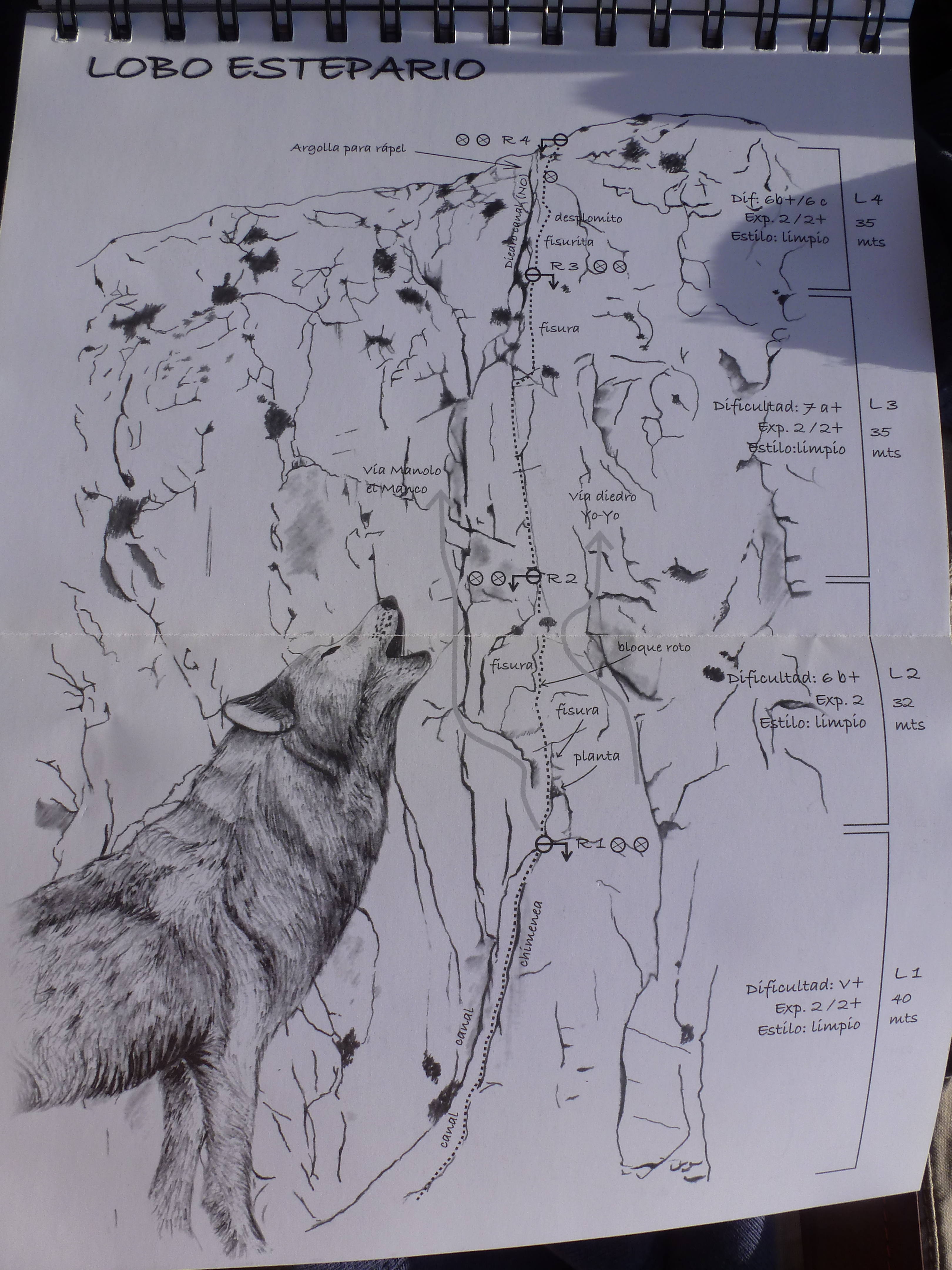 - Lobo Estepario (135m, 7a+): limpiada desde arriba de plantas y posteriormente abierta desde abajo totalmente limpia, a excepción de las reuniones con parabolts rapelables. Esta excelente escalada discurre sobre un sistema de fisuras donde se pueden hacer ringlocks y algún que otro empotre de mano. Un par de juegos de micros (incluso por triplicado el alien amarillo y rojo) nos harán disfrutar de esta vía de Pedro Soto y Rubén de Francisco. Como contraposición, a pocos metros de esta vía discurre la vía «Manolo el Manco» con 114 chapas en sus 130m de recorrido que se podrá hacer con poco más de 30 expreses (para quien tenga tantas y le entren en el arnés, ¡claro está!).