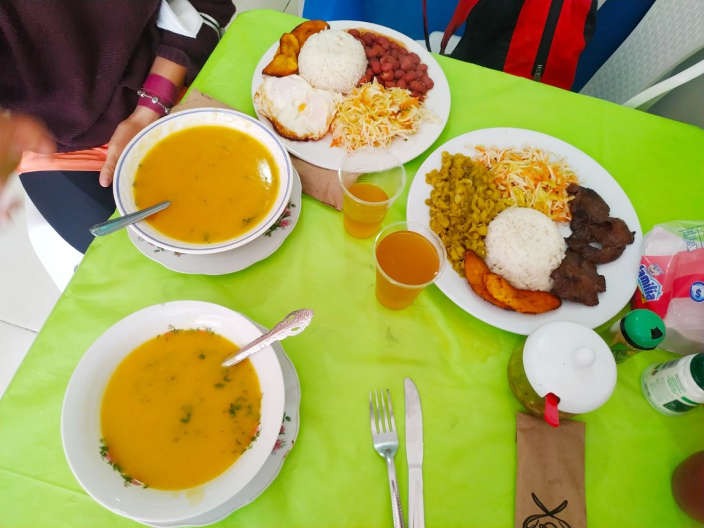 Menú del día en Colombia por 1.5 euros: sopa de primero, zumo natural y plato principal de hidratos y carne. Uno de los países con un menú más económico y rico que hemos conocido