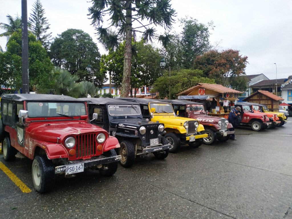 Comemos en un restaurante el menú del día por 1.5 euros por persona. ¿Cómo puede ser posible obtener un beneficio ofreciendo primer plato, segundo plato y zumo de frutas por este precio? Un caballero de la mesa de al lado inicia la conversación con nosotros y tras un rato de charla se ofrece a llevarnos en su vehículo a Salento, otro colorido pueblo del Eje Cafetero, mucho más turístico y concurrido que Filandia. Resulta llamativo que los vehículos que se usan para el transporte de pasajeros entre pueblos y en las veredas agrícolas sean Willys de los 60-70, que todavía funcionan a las mil maravillas. Al ver estos coches sonrío pensando en nuestro Opel Kadett del 88, todavía un chaval y con mucho por trotar.
