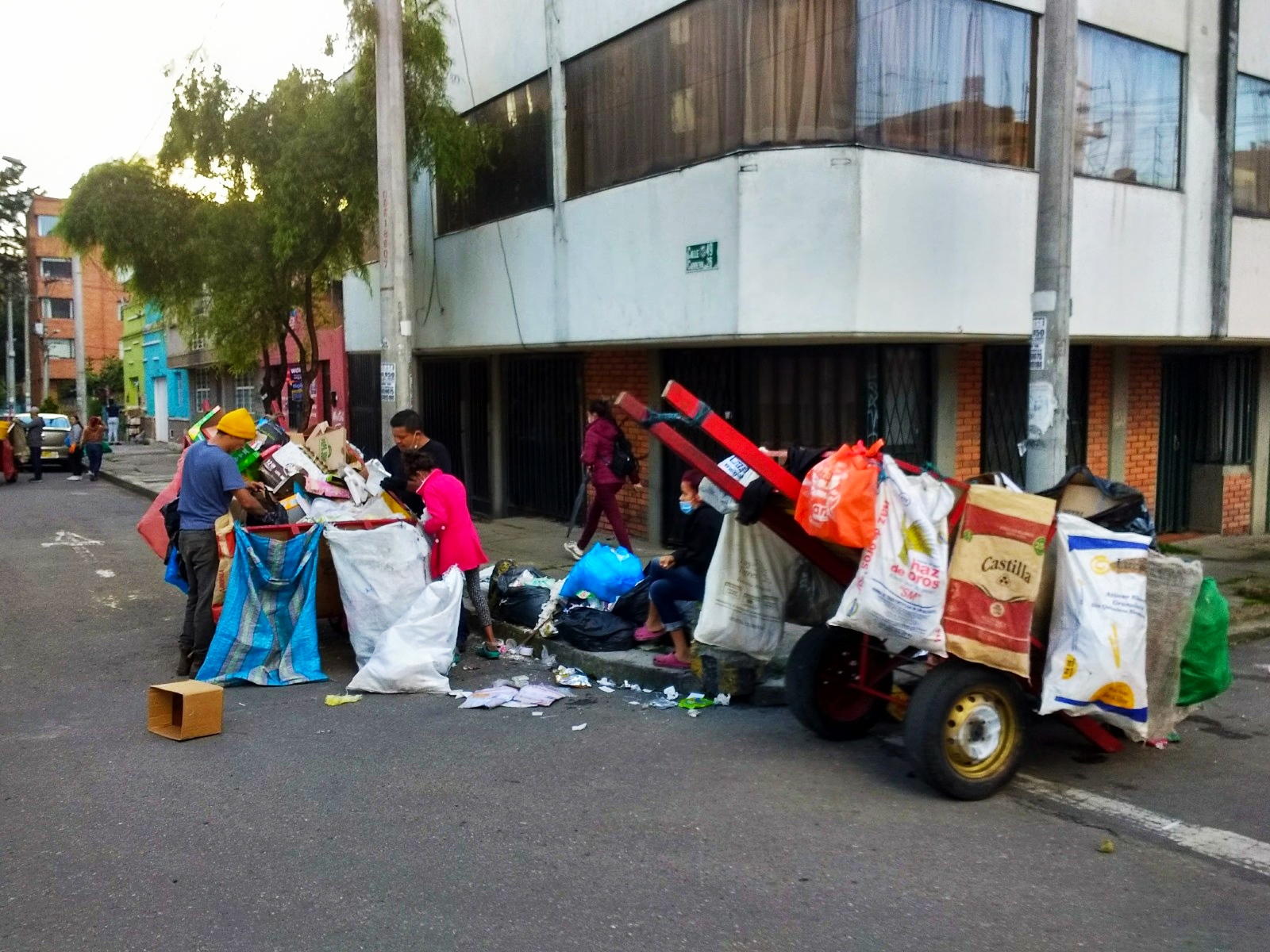 Otro de los elementos que nos llaman la atención en Bogotá es que el reciclaje no está centralizado y en su lugar son casi 11.000 las personas que recorren a diario la ciudad arrastrando carros y separando con sus manos muy frecuentemente desnudas el plástico, vidrio y metales. Muchos de ellos son venezolanos, recién llegados, quienes en sus carros llenos de basura llevan también a sus hijos. También muchos de ellos pernoctan cada noche en el mismo carro donde transportan su basura. En el pasado eran animales los que arrastraban los carros, pero la Alcaldía decidió cambiar la imagen de una Bogotá llena de animales de tiro por una mucho más “desarrollada” ciudad de carros de tiro humano. – El vidrio cotiza a 2 céntimos de euro el kilo, mientras que el cartón a 7, el plástico a 13 y las latas a 67 céntimos, nos dice una recicladora venezolana recién llegada. -En un buen día nos podemos sacar hasta 12 euros entre dos personas y los porteros de algunos edificios de estratos altos (donde previsiblemente habrá más latas) se han comprometido en dejarnos la basura a nosotros, nos cuenta con el orgullo de aquel que escapa de un país donde su salario mínimo mensual no da ni para comprar un cartón de huevos – y no es ninguna exageración. Como soy aficionado a los números me doy cuenta de que esa mujer necesitará arrastrar casi 550 kilos de vidrio, tirando del carro durante kilómetros entre la caótica circulación de Bogotá para hablar de un buen día. Tras conocer lo que se esconde detrás de nuestra basura, lavaremos los envases de plástico para hacerles un poco más agradable su trabajo. Los martes y jueves una multitud de personas arrastran sus carros por nuestra calle y cuando entrego mi basura a un reciclador su respuesta es “gracias”. En pocos lugares al entregar nuestros deshechos recibiremos una respuesta semejante.