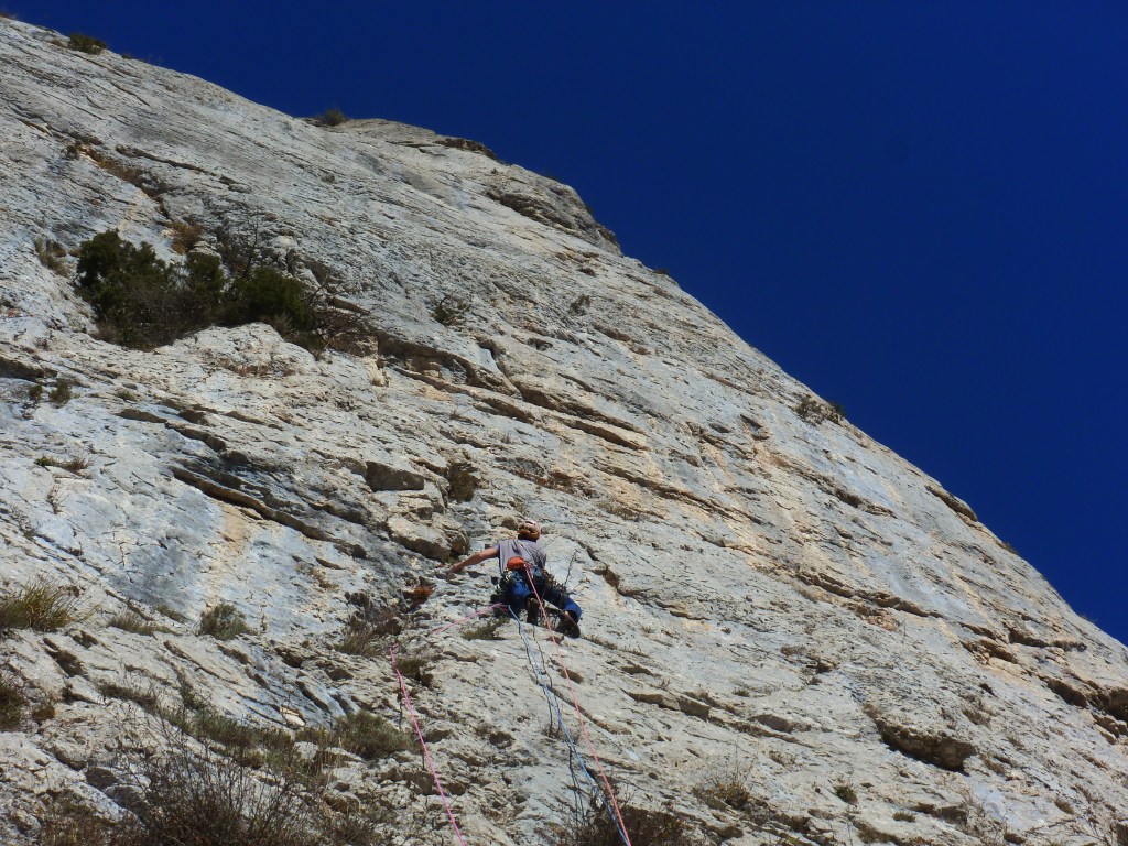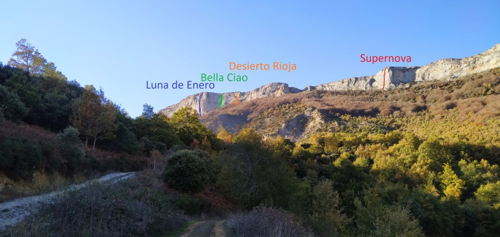 Habíamos fichado el pilar sur del San Tirso hacía 10 años, durante la apertura de Luna de Enero, el cual había permanecido inalterado hasta este octubre, cuando volvimos a pasar cerca de su base durante las aperturas de «Bella Ciao» y «Desierto Rioja» y decidimos catarlo. La calidad de roca de este pilar es fuera de lo normal, con una placa de caliza blanca compacta impresionante, con agujeros lo suficientemente profundos para protegerse muy bien con seguros flotantes. En un día conseguimos abrirla a falta de los últimos cinco metros, donde un parabolt que se nos cayó en la aproximación nos hizo falta para poder acabarla. Con calizas como esta no nos importó mucho volver a subirla y rematarla.