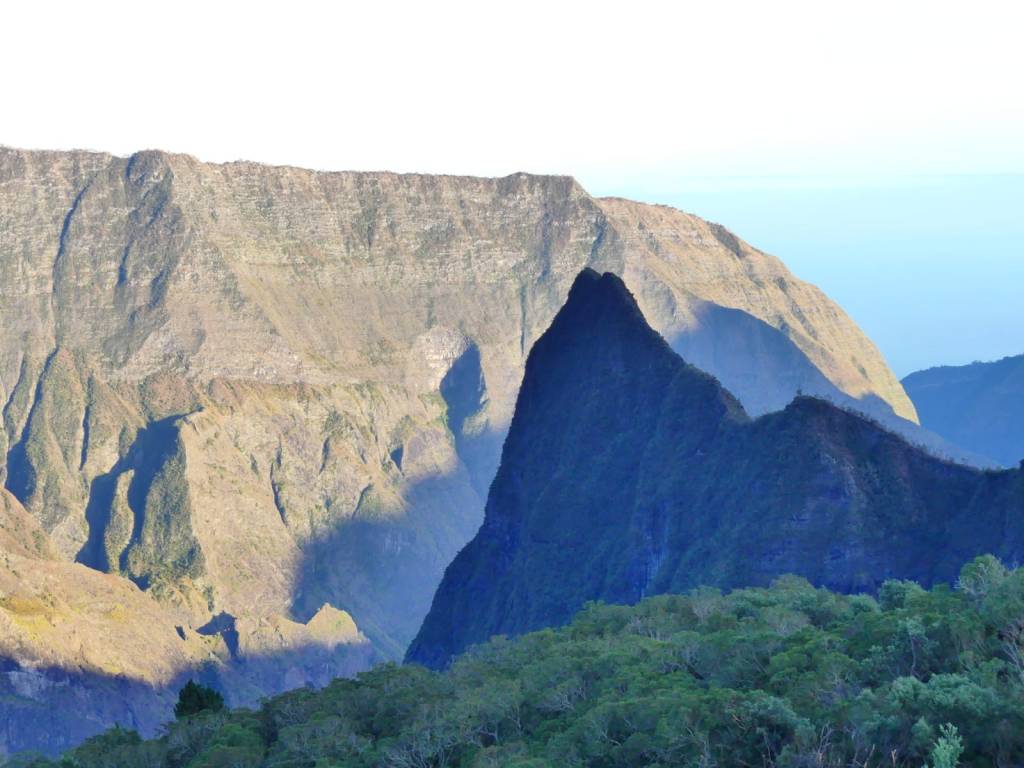 Comenzamos con la cascada de Grand Galet y el valle del río Langevin. La primera percepción que tenemos es que también va a ser un viaje de olores, ya que la vegetación, en su mayoría en flor en esta época, lo impregna todo. Acostumbrados a los bosques europeos, de un olor bastante limitado buena parte del año, en La Reunión se pueden inspirar muchos modelos de ambientadores. Especialmente en las madrugadas, algunas flores como el Longoze Amarilla se abren y comparten su olor dulzón a miel para ser polinizadas por los murciélagos y compensan la oscuridad, solo quebrada por la luz del frontal, con un éxtasis de olores. Durante el día las hortensias arborescentes, que crecen a ambos lados de las carreteras sin cuidado alguno inundan de azules y rosas las cunetas.