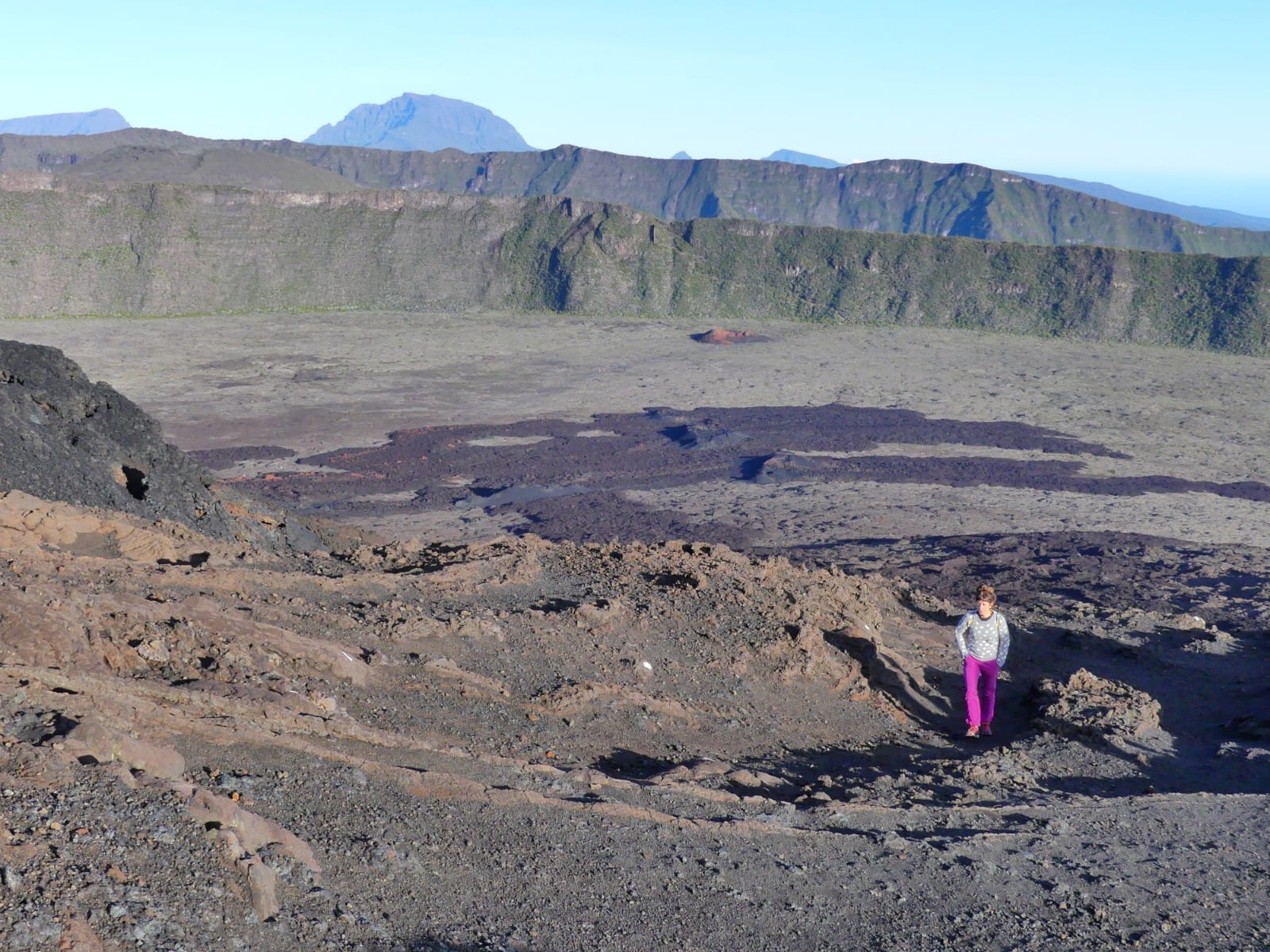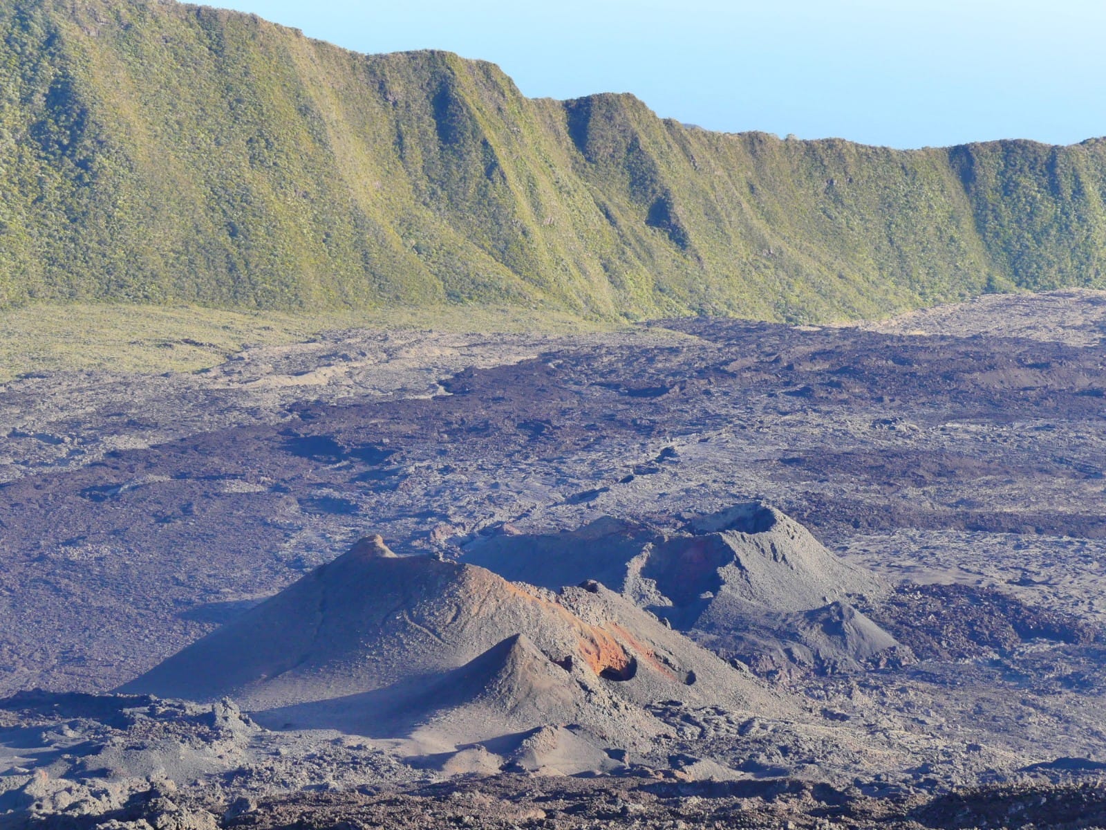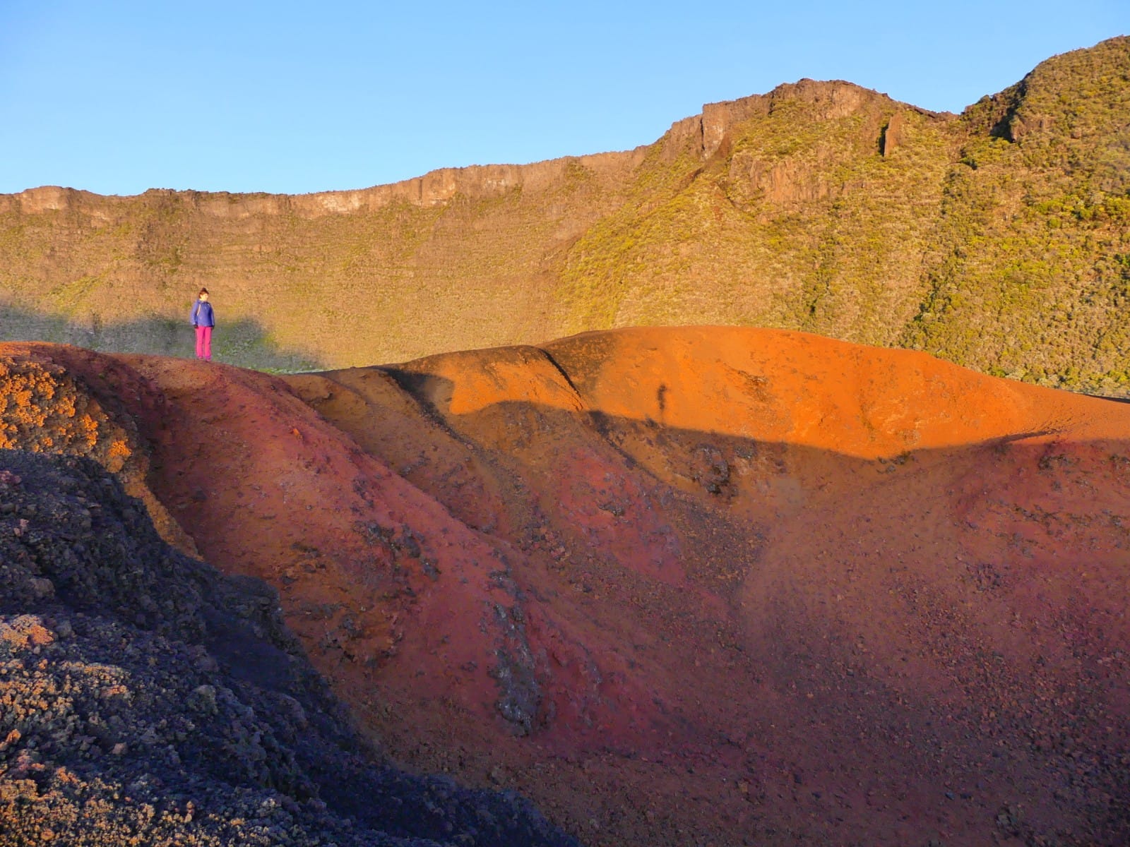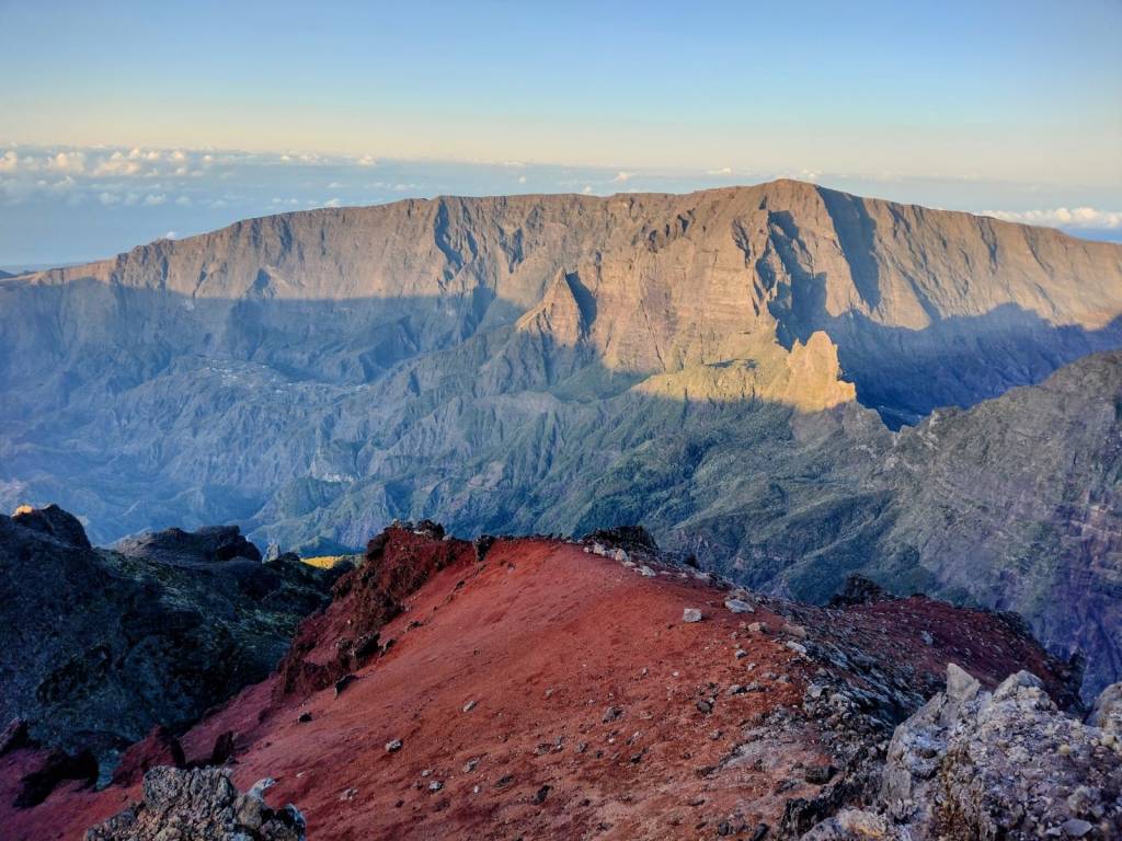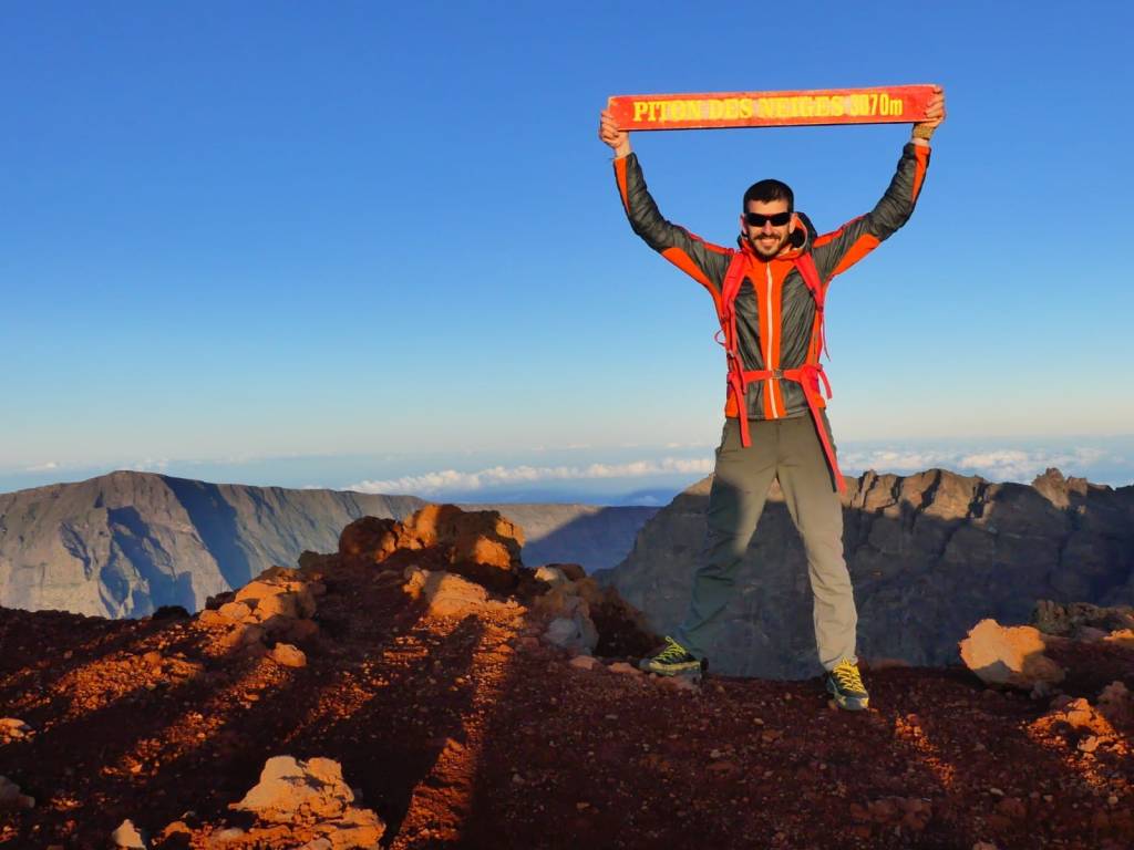 El pitón de las Nieves es el techo del océano Índico y con sus 3.070m alguna vez ha acumulado nieve en esta latitud. Para ascenderlo elegimos la vía del cráter de Cilaos, cuya carretera de acceso al cráter es una obra de ingeniería impresionante. Los zigzags atraviesan zonas de ceniza volcánica apelmazada y los continuos desprendimientos provocan cortes en la carretera. Fue allí donde los primeros habitantes de la isla, los malgaches tomados por los conquistadores franceses como esclavos para domesticar este territorio selvático, escaparon de los europeos en este circo para vivir libres y rodeados de unas vistas difícilmente mejorables. Desde el circo de Cilaos solo nos quedan 1.700m positivos hasta la cumbre. La idea es subir de noche, ver el amanecer en la cima, bajar rápido y disponer de todo el día para conocer otras cosas. Dicho y hecho, a las 2am empezamos el ascenso y vamos pasando a varios grupos de franceses, alguno de los cuales hizo el monte en vigilia saliendo del aparcamiento al anochecer. El cálculo es milimétrico y según coronamos el sol despega. Desde allí se divisa toda la isla sin nubes, unas nubes que van apareciendo durante el día según la temperatura aumenta y evapora la humedad de la vegetación, conocidas como nubes orográficas. Bajamos con energías para darnos un buen baño en las mismas aguas que se desprenden de la cumbre y continuar la ruta hacia el Pitón de la Fournaise, el volcán activo que cada año o dos hace erupción.