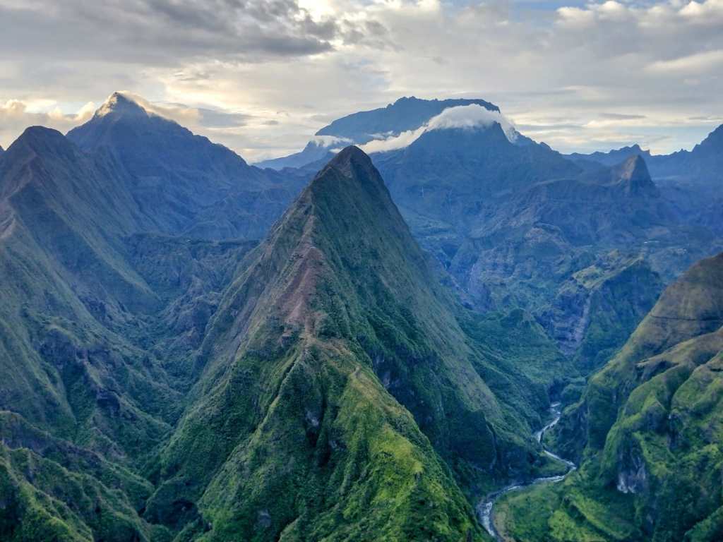Aterrizamos en Saint Denis, la ciudad colonial por excelencia de la isla. Recogemos nuestro diminuto coche de alquiler y descubrimos que el roaming con nuestras compañías telefónicas aquí es inexistente. Recuerdo con cariño lo de “es una provincia tan francesa como Normandía”. – Nos tocará la pesca de wifis abiertas, como tantas otras veces. Así logramos quedar a comer con Mathieu, el jefe del potente grupo de investigación de 80 personas que estudian la energía solar en ambientes tropicales. Ha vivido en Gijón y en un perfecto español -qué raro viniendo de un francés- nos pondrá en conocimiento de la abundancia de tiburones en la isla: de hecho, fue el lugar del mundo con más ataques de escualos hasta que se prohibió el baño en toda Reunión por este motivo. Con la misma sonrisa del que habla de una pared de escalada sin abrir, nos confiesa que él surfea a diario, solo cuando el agua no está turbia para evitar confusiones y si hay también algún otro colega en el agua para reducir las posibilidades. Sin tanta sonrisa nos confiesa que perdió a algún amigo muy cercano atacado por estos peces y que él también tuvo un susto. Cuando nos tomamos el postre nos dice que somos afortunados de llegar cuatro días después del paso del último ciclón, que dejó precipitaciones de mil cuatrocientos litros por metro cuadrado, sí, casi lo que cae en tres años en muchos puntos de España. La isla es claramente muy salvaje y solo llevamos unas horas.