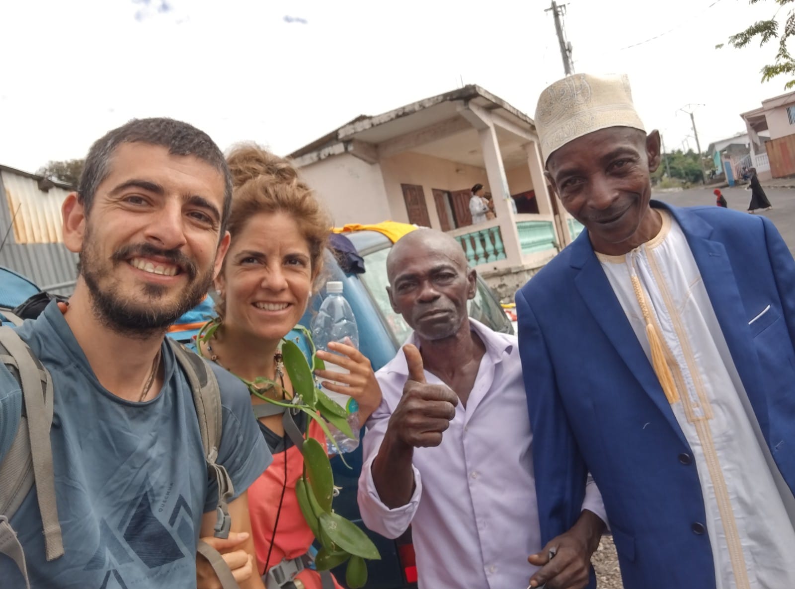 Estamos prácticamente en el extremo opuesto de la capital tratando de circunvalar la isla. Conforme avanzamos en esta empresa, cada vez pasan menos vehículos y el asfalto se torna en  un bien escaso. A pesar de que sea la Nacional 1 del país, en España no dejaría de ser un camino de tractores para acceder a la viña más apartada del pueblo. Decenas de vehículos franceses yacen a los lados de la carretera, abandonados por cualquier fallo que no consiguen arreglar. La vegetación los va engullendo poco a poco mientras los baobabs custodian desde la altura todo el panorama. En esa tupida vegetación es donde crece la vainilla rodeando los troncos de otras plantas. Lo bueno del autostop es que los propios conductores nos enseñan de botánica durante el camino. Mientras esperamos que nos den un aventón para llegar a Buuni pregunto en el bar del pueblo (bar en el que solo se vende CocaCola) si alguien nos puede vender vainilla. Un señor mayor nos dice que él mismo puede. Vuelve al bar con un kilo de vainilla envuelta en papel de aluminio. Al precio que tiene en Europa eso valdría una auténtica fortuna, pensamos mientras comprobamos su calidad. Según sabemos debe estar húmeda, poder doblarse sin llegar a partirse y mayormente no soltar semillas. Como cumple todas estas condiciones, acordamos un precio justo por un buen puñado y cerramos el trato con un trago de CocaCola.