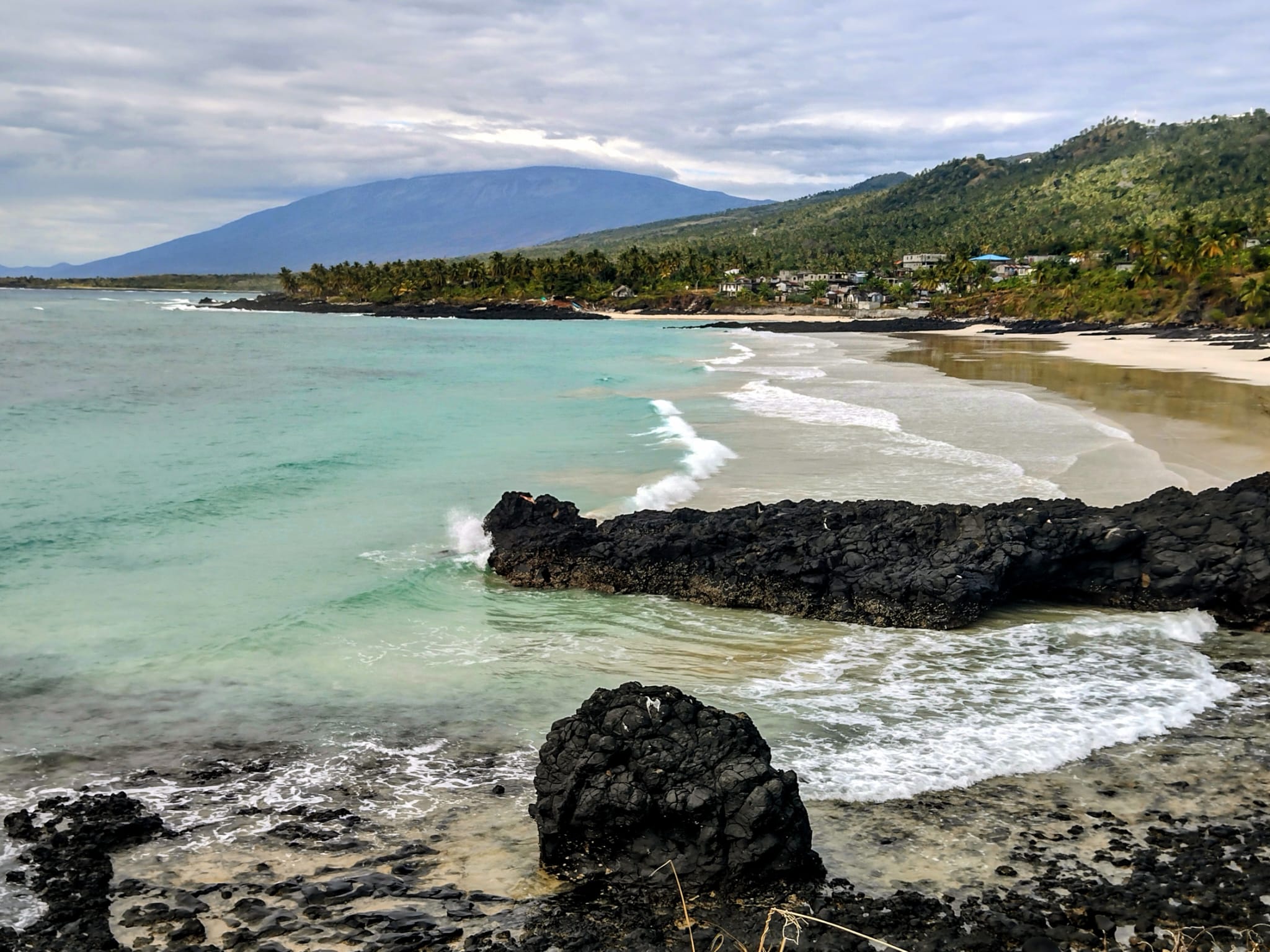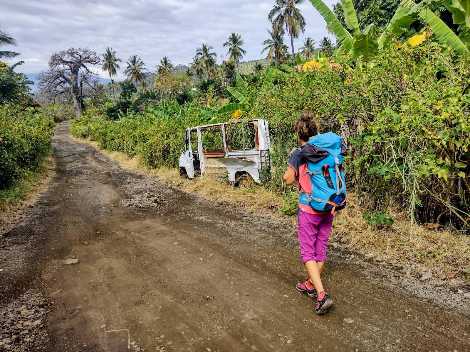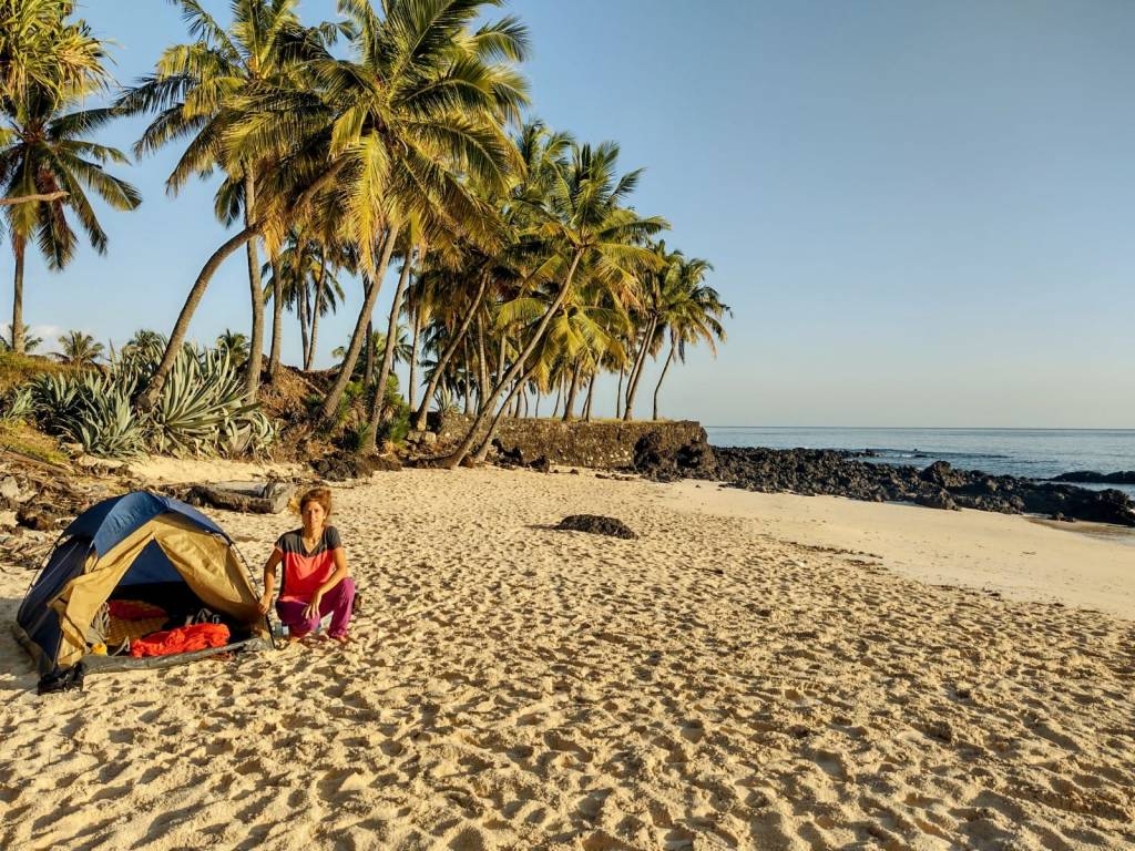 Bajamos temprano con la luz de los frontales. No hemos podido dormir nada porque nuestros sacos sábana son insuficientes a esa altura y entre estar pasando frío por la humedad de la niebla y entrar en calor bajando a buen ritmo, optamos por lo segundo. Un par de cacatúas negras sobrevuelan encima de nosotros, por cierto, un ave extremadamente rara que el propio narco Pablo Escobar mandó comprar a doblón para su casa como una excentricidad en un país como Colombia en el que las cacatúas son azules o rojas. Los sonidos del bosque marcan el pronunciado descenso hasta la costa donde cargamos energías antes de tomar una furgoneta compartida que nos lleve al norte de la isla, a Mitsamiouli y concretamente a la playa de Galawa. El color verde esmeralda y los cocoteros en la misma orilla nos invitan a quedarnos a dormir. Plantamos la tienda de campaña sin más compañía que las olas y algún cangrejo. Una nube pasa y nos ducha, una buena forma de quitarnos la arena y la sal de la piel.