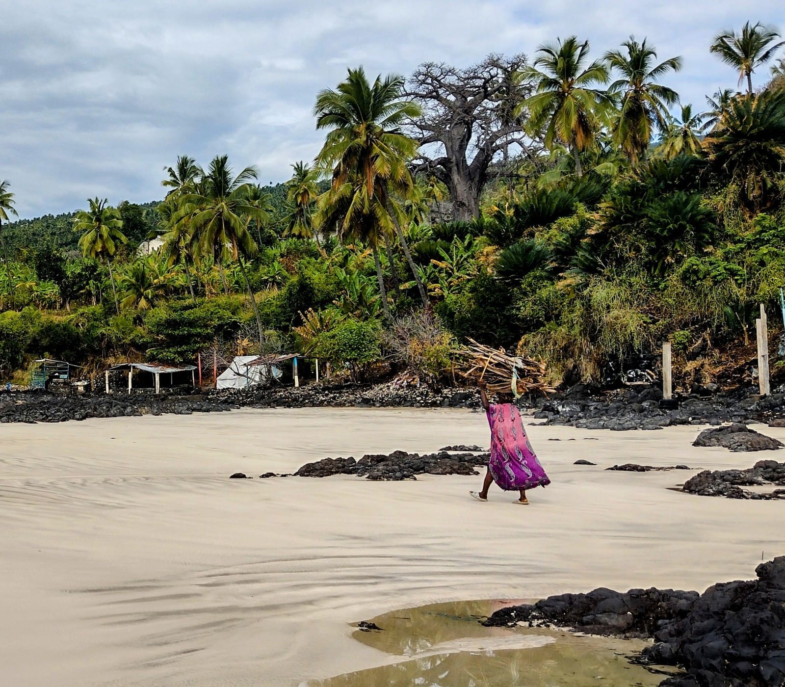 Mujer acarreando leña para cocinar en la fabulosa playa de Buuni