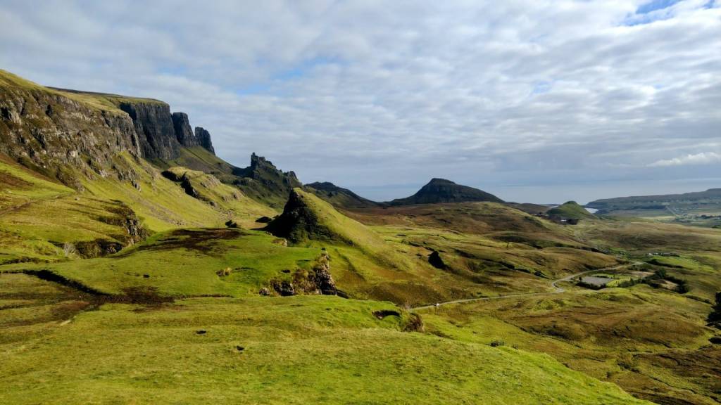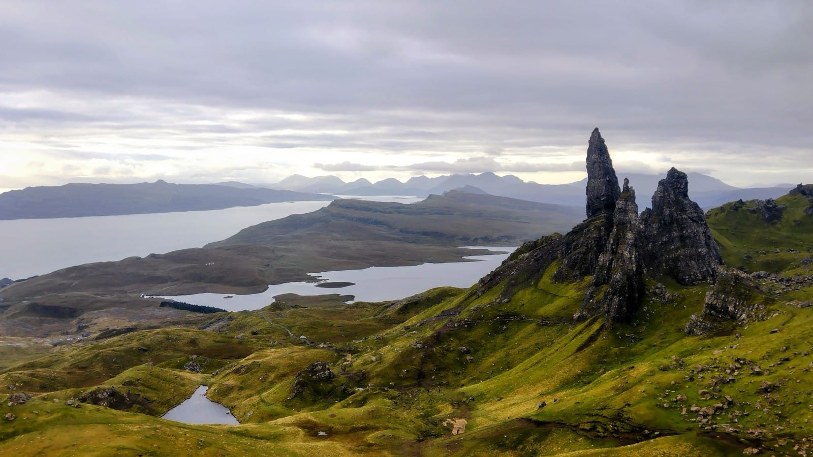 El castillo de Eilean Donan, estratégicamente ubicado daba conexión a la isla de Skye con el “continente británico”. A pesar de las fechas, la luz mortecina, la humedad y el viento se asemejan más a nuestro mes de diciembre, pienso mientras conduzco entre ovejas y vacas escocesas de melenas largas. No me extraña en absoluto por qué tantas marcas de automóviles graban recurrentemente sus anuncios en este mismo asfalto, rodeado de un entorno transformado por siglos de ganadería, pero bellísimo. El Old Man of Storr, una aguja de roca negra se levanta sobre el verde de esa hierba que no conoce el sol ardiente.