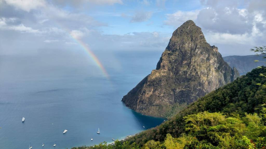 Desde allí intentamos acercarnos al punto de partida para subir al monte Gimie -el monte más alto de Santa Lucía- y también para encontrar un lugar donde pasar la noche. Desde el primer momento, el pueblo nos resulta un lugar hostil, con varios buscavidas un poco pesados a nuestro alrededor, un calor bananero y unas nubes que amenazan descargar. Tras un buen rato, desistimos de subir a este monte al no encontrar una opción clara ni de pasar la noche, ni de librarnos de los cansinos del lugar, que no dan muy buenas sensaciones. Hacemos autostop y salimos de allí en el primer vehículo que pasa, que nos devuelve a la carretera principal de la isla. Borrón y cuenta nueva, caminamos los 5 km que nos separan del sendero Tet Paul, un proyecto comunitario que tienen los campesinos para vender las vistas del Gros Piton, un espectacular pico que emerge del mar, en lugar de sus frutas.
