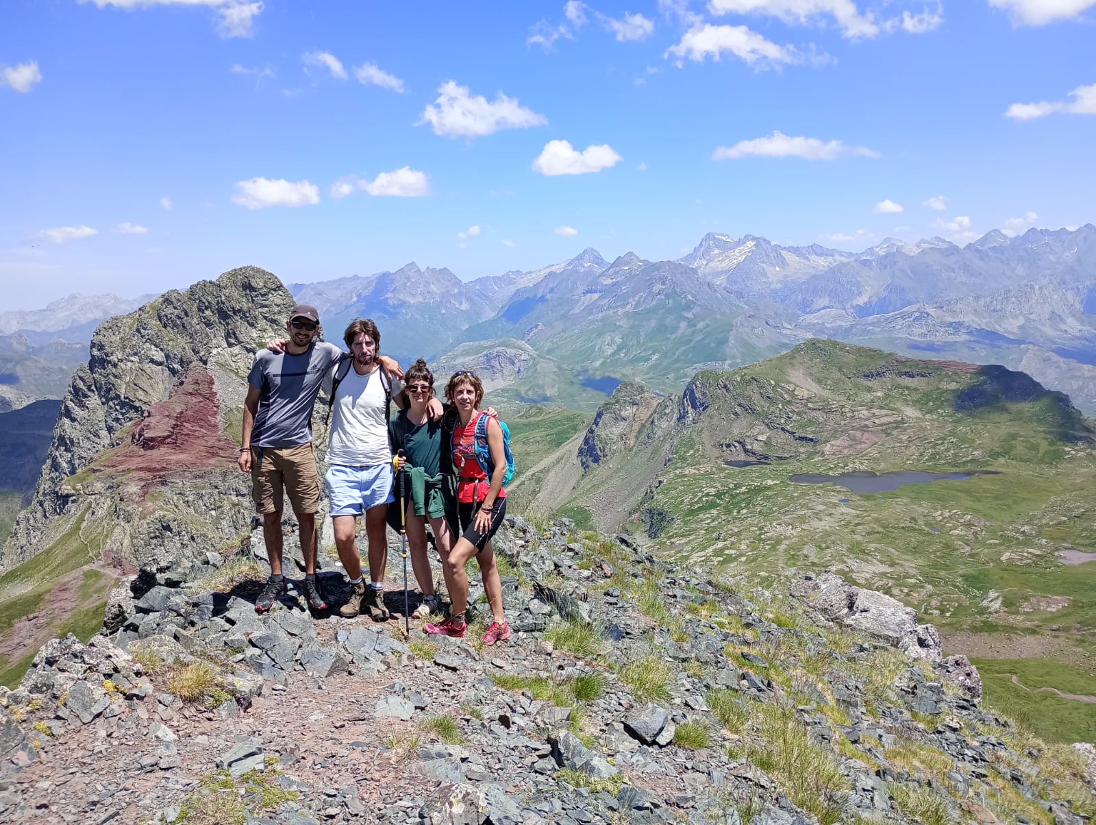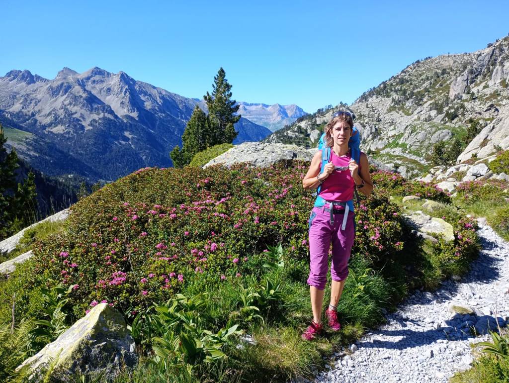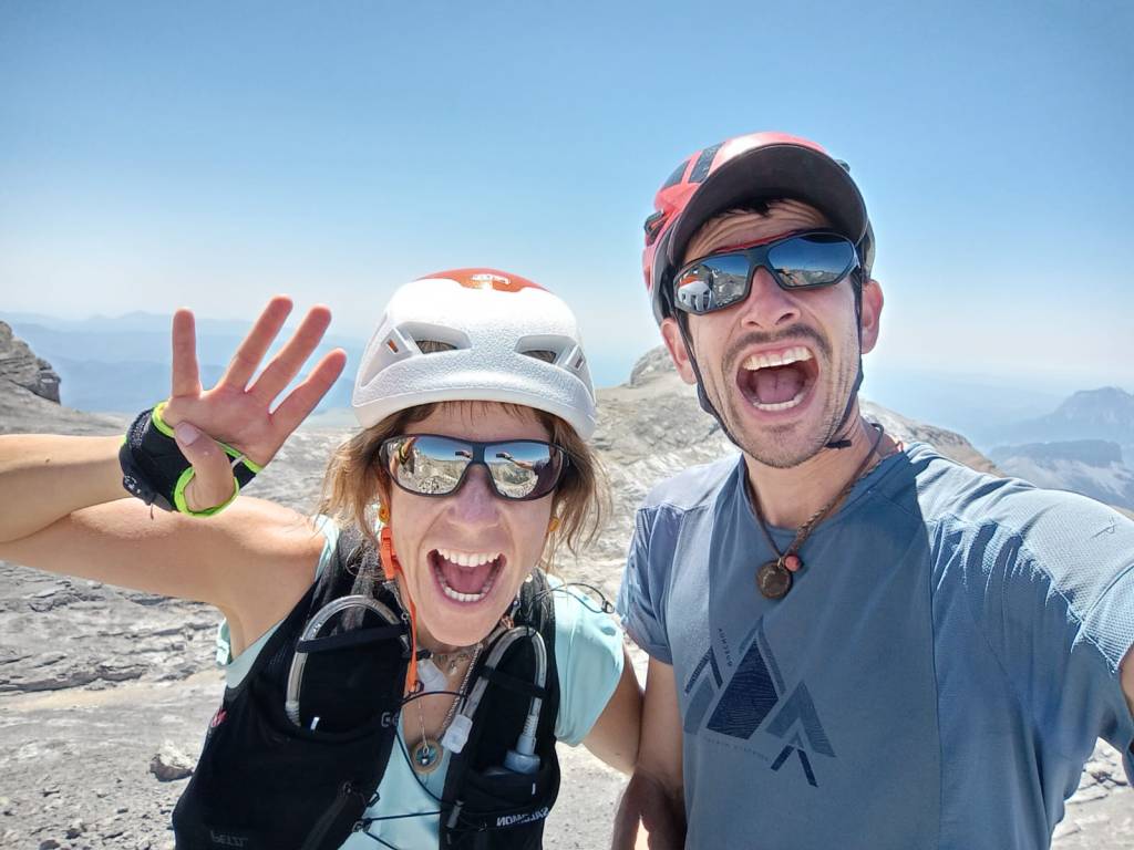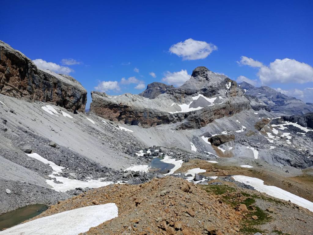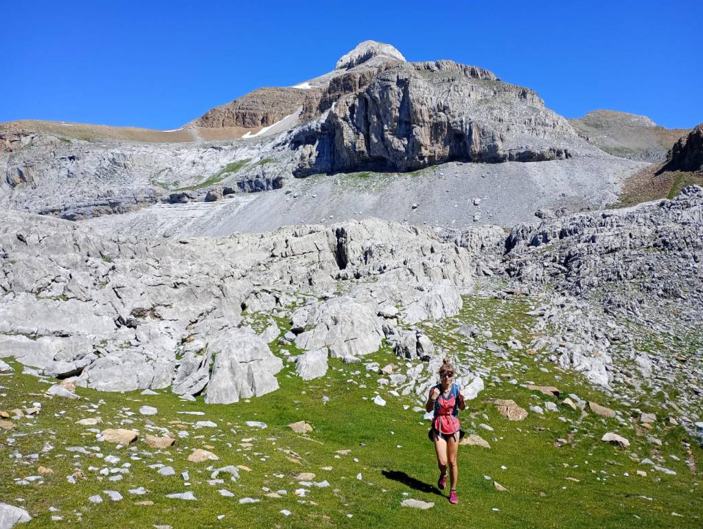 Las lluvias abundantes de junio aliviaron de forma puntual la intensa sequía que las montañas del Prepirineo y del propio Pirineo habían sufrido durante una prácticamente inexistente primavera. Llegamos a las faldas del Aspe (2645m) desde Aísa, al día siguiente de la última gran tormenta de junio. La tierra no puede acumular más humedad y los pastos reflejan un verde casi asturiano en el que las senderuelas dibujan trazados alargados. La preciosa ascensión al Aspe, la cumbre más occidental que ascenderemos esta vez, será una introducción a las dosis de belleza que experimentaremos después. Tras el Aspe, al día siguiente, otro coloso calizo como la Collarada (2886m), con su tremendo desnivel desde Vilanúa, será un buen ejercicio de prueba para nuestras piernas. Ascendemos a un ritmo de unos 600m positivos por hora y para el tiempo de comer ya hemos bajado y nos hemos dado un chapuzón bajo el puente que todavía hoy soporta al “canfranero”, el tren de vía estrecha que se adentra en el valle del río Aragón. Además, en el mismo Canfranc probamos la caliza del valle escalando en el sector de Meses, un lugar mágico con sombra de tarde.