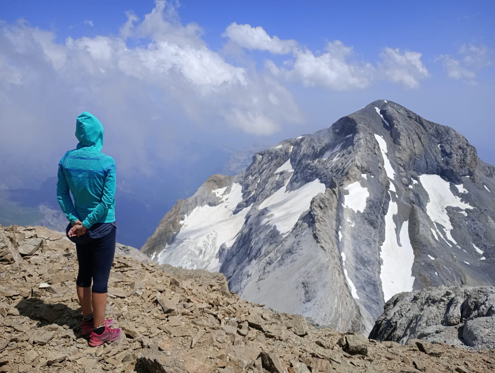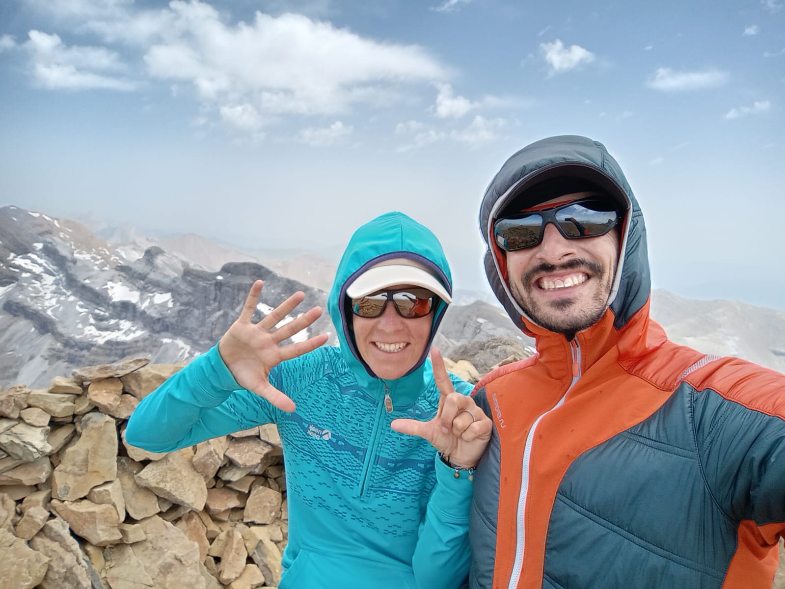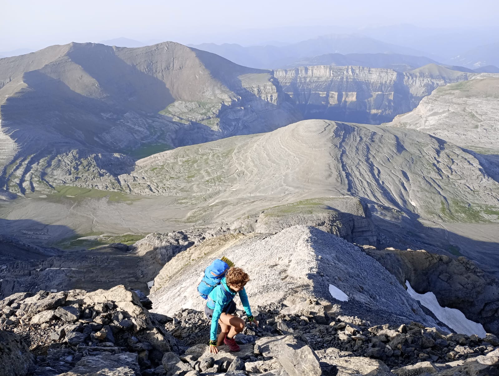 Entrenados ya de montaña, decidimos acometer el plato fuerte: el de realizar un buen surtido de tresmiles de Ordesa. Cargados de comida, tienda y sacos de dormir comenzamos desde Bujaruelo con el Taillón (3144m), el Pico Royo (3051m) y los dos Gabietos (3034m) el primer día. Vivaqueamos cerca de la Brecha de Roland para continuar el segundo día por el Casco (3011m), Torre de Marboré (3006m), Espalda de Marboré (3073m), los tres picos de la Cascada (3095m-3161m), el pico de Marboré (3248m), el Cilindro de Marboré (3325m) y el pitón SW del Cilindro (3194m). Esa noche vivaqueamos cerca del lago helado del monte Perdido. El tercer día acometemos temprano la subida al monte Perdido (3355m) por la Escupidera, que a estas alturas del año ya no tiene nieve y en media hora nos plantamos en la cumbre con un viento de unos 80km/h. El viento no anima a continuar la jornada con los tresmiles que nos quedan, algunos con pasos de arista como el Baudrimont NW y decidimos retirarnos a cotas más bajas para volver en otra ocasión, no sin antes subir el Nudillo del Perdido (3176m).