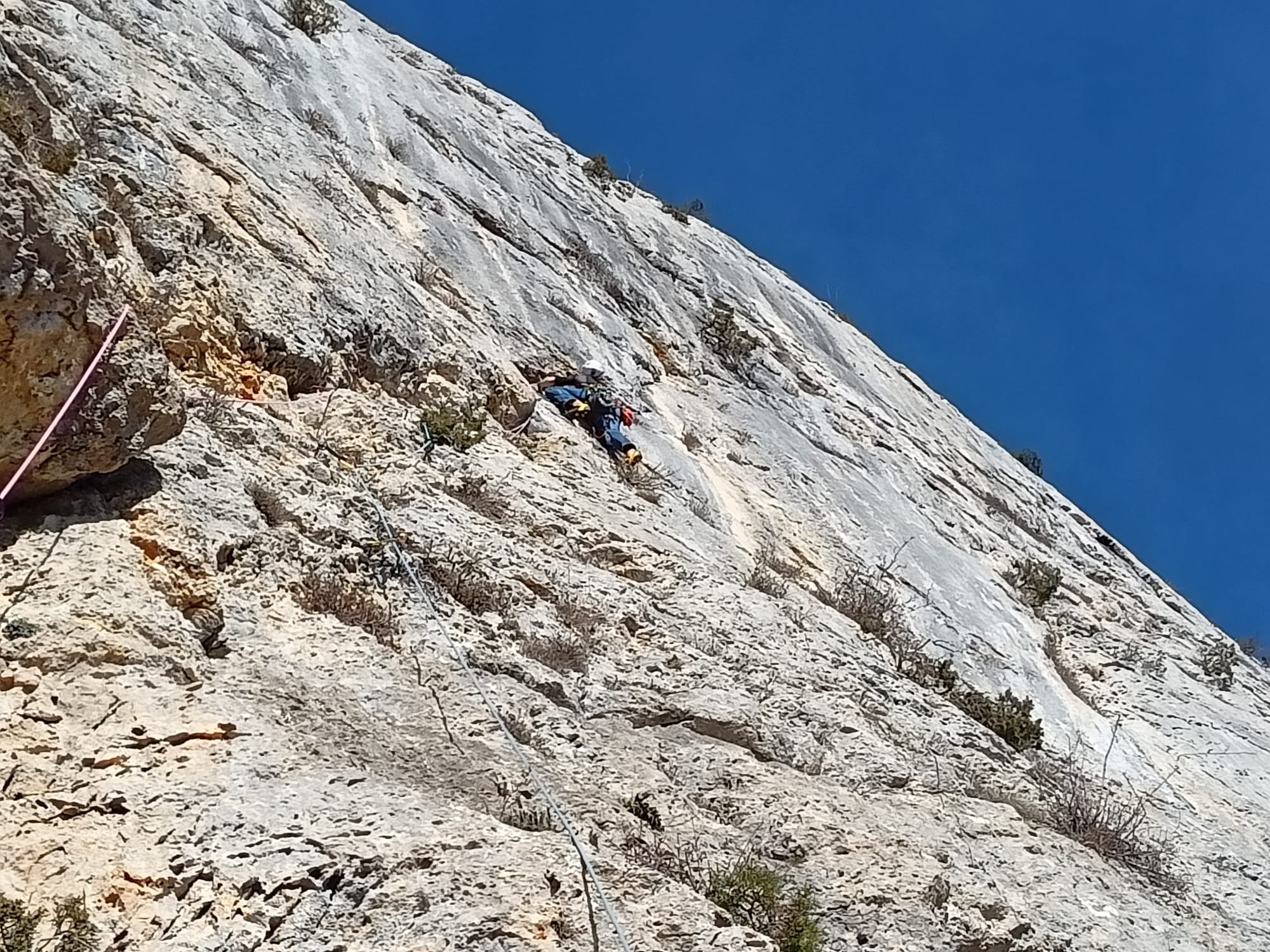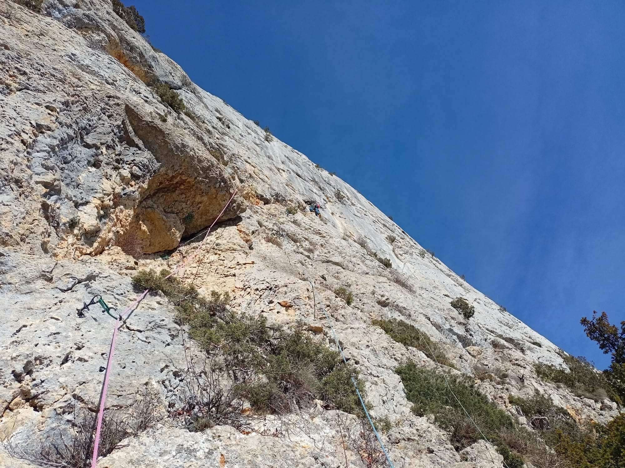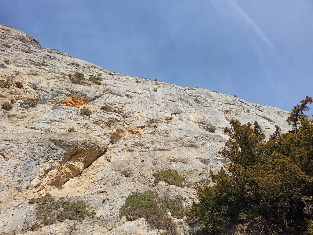 Aprovechando el ya clásico anticiclón de Noche Buena, nos dirigimos a la Peña del León. Una serie de líneas obvias en forma de fisuras y diedros rajan esta caliza a ratos amarillenta, a ratos azulada de arriba a abajo. Los caminos se hacen al andar, pero muchas líneas de escalada llevan siglos esperando ser caminadas. Esta es una de ellas. Un gran tejo escudado en la roca, nacido en tiempos más frescos en plena cara sur nos señala el inicio de esta escalada atlética y disfrutona, limpia de chapas, a excepción las de la primera reunión. Un par de pitones y algún puente de roca servirán de faros a los que se animen a conocer estar preciosa y desconocida pared visible desde el concurrido monte San Tirso.