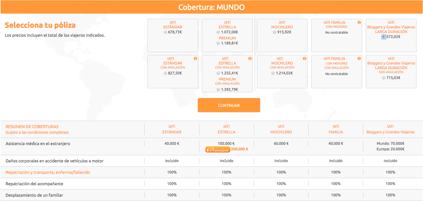 Para viajes de más de 90 días, por ejemplo el caso de una vuelta al mundo, nosotros hemos encontrado solo dos compañías de seguros atractivas: World Nomads e IATI. Hemos hecho el ejercicio de ver lo que cubren sus seguros básicos y el coste que tienen suponiendo un viaje de un año por Estados Unidos, Sudamérica y Asia (desde el 1 de enero de 2018 al 31 de diciembre de 2018).